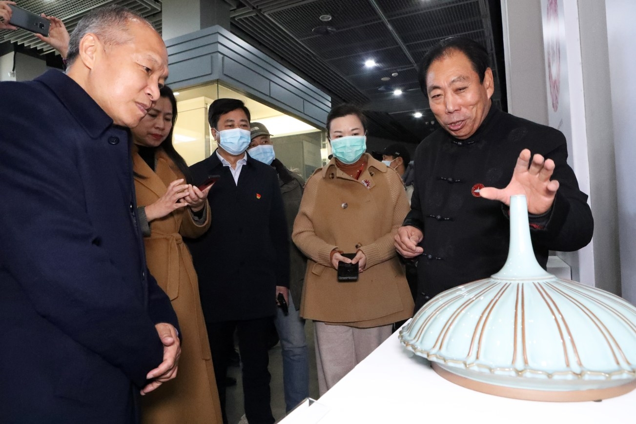 12月30日,“钧瓷烧制技艺”河南省级非物质文化遗产代表性传承人刘建军向参观者介绍钧瓷作品《清莲》。