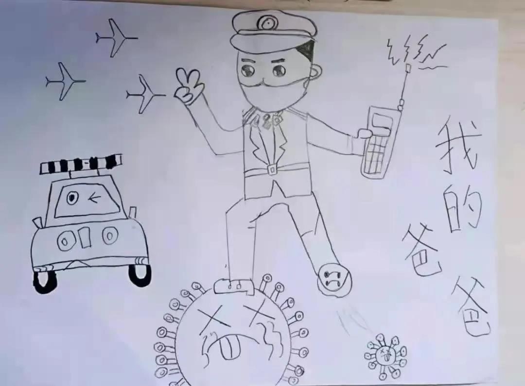 这幅画寓意明显,一看便知儿子对警察父亲充满了崇拜,希望爸爸加油,早日战胜疫情!