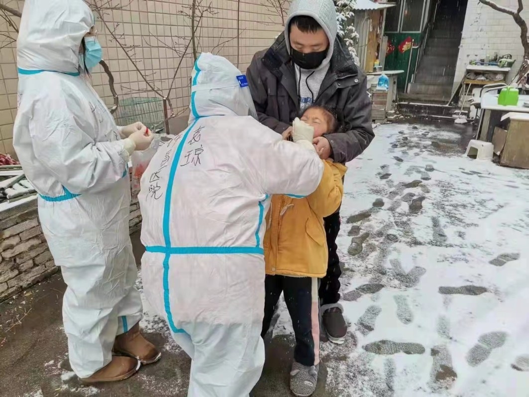 来自许昌医院(原许昌县人民医院)的王秋艳、司文艳、李萌迪3位“白衣天使”依然奋战在禹州抗疫一线,和众多医护人员一起顶风冒雪对重点人群、重点区域进行核酸检测。