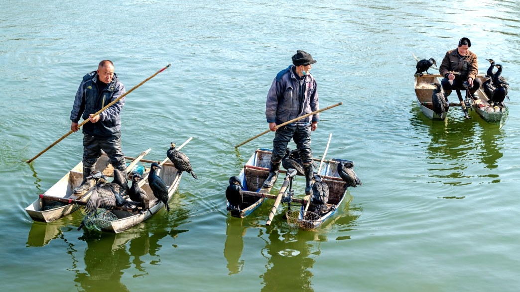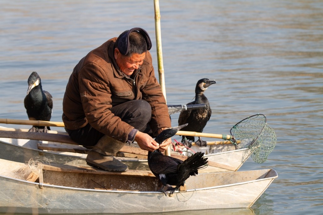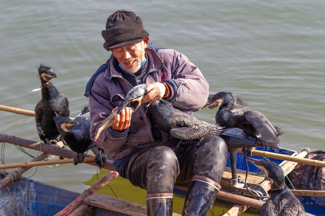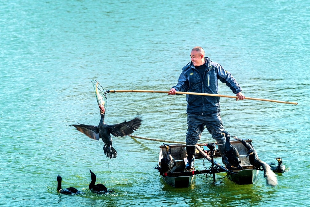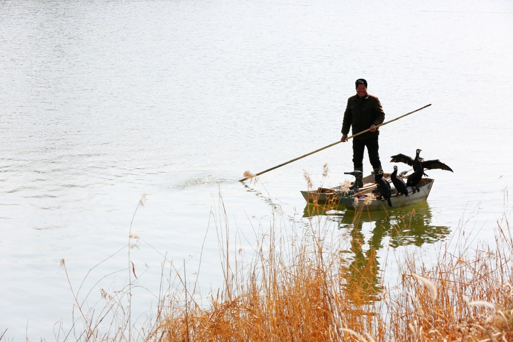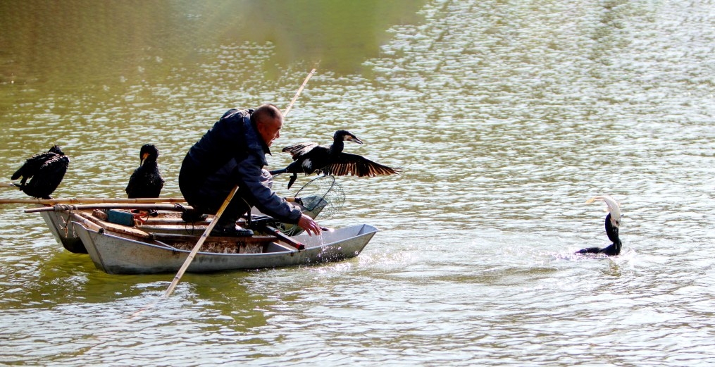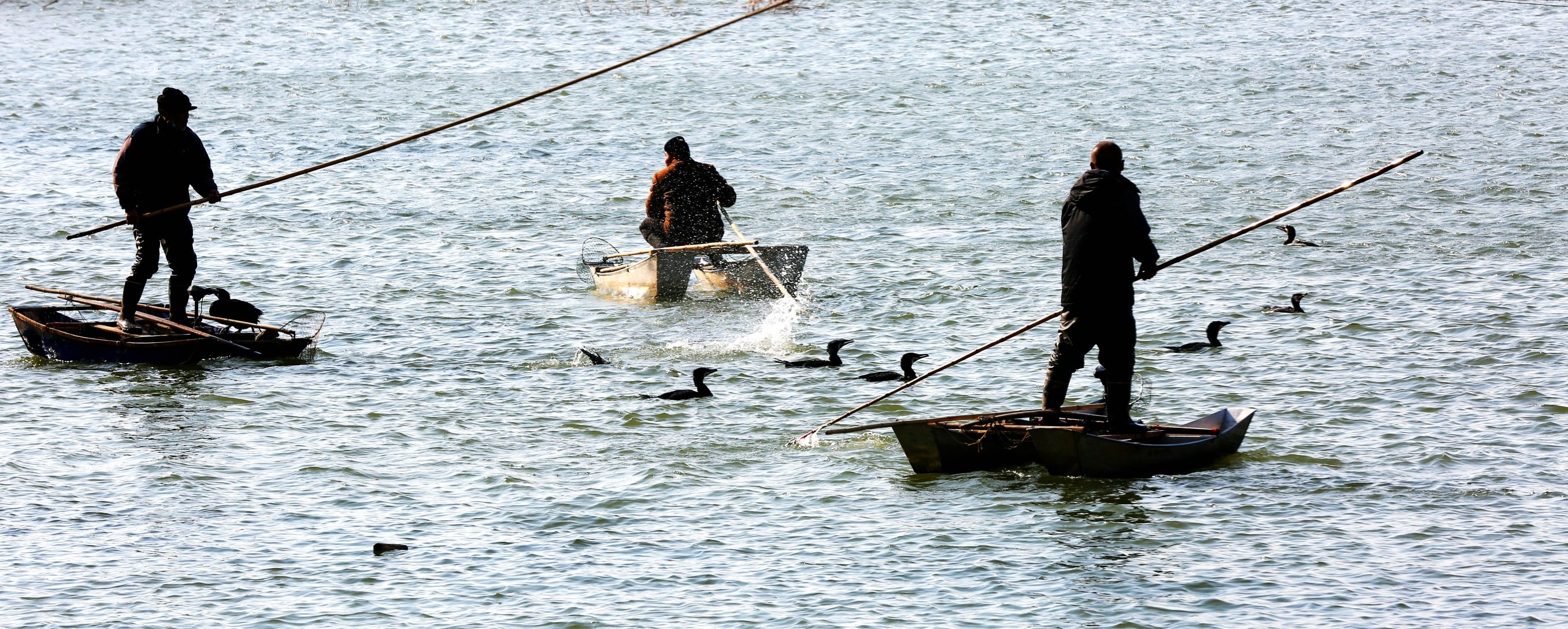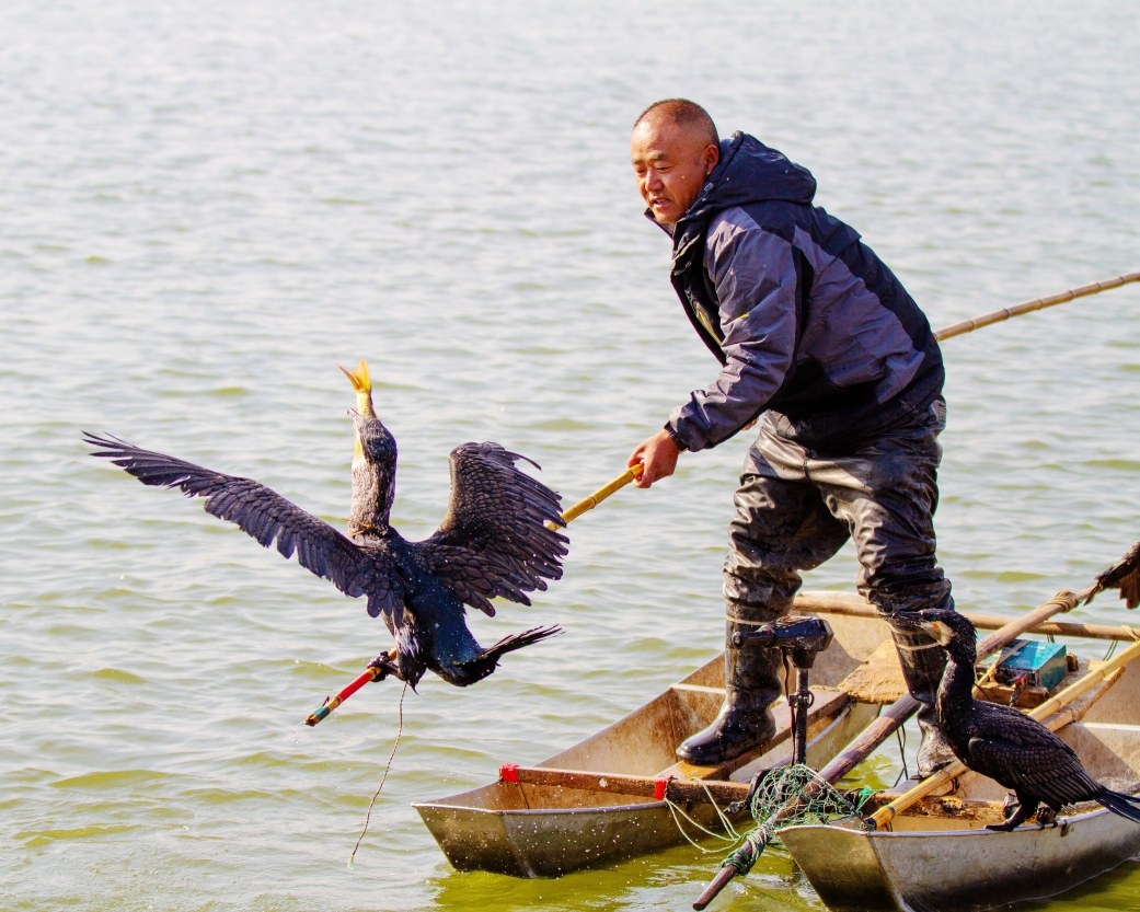 鱼鹰的学名叫鸬鹚,是一种体型较大的水禽,极擅潜水捕鱼。鱼鹰下水前,先用绳子在其颈部系一个活套,防止其捕到鱼后吞食。主人站在小船上扬起竹竿,有节奏地抽打水面,鱼鹰争先恐后地钻进水里。鱼鹰捕到鱼后会游向主人的小船边,主人抓着鱼鹰的脖子,从鱼鹰嘴里把鱼取出,然后鱼鹰又转而下水。