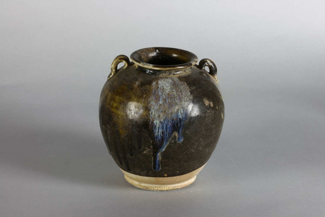 许昌博物馆展出的唐代黑釉彩斑瓷罐高17厘米,腹围54厘米,底径10厘米,侈口、束颈、鼓腹、假圈足,肩部有两个对称的桥型系,器身内外饰黑釉不及底,上部饰蓝釉彩斑四块,古朴的造型,厚重的釉色,乍一看,这件器物与我们常见的色彩斑斓的钧瓷截然不同。