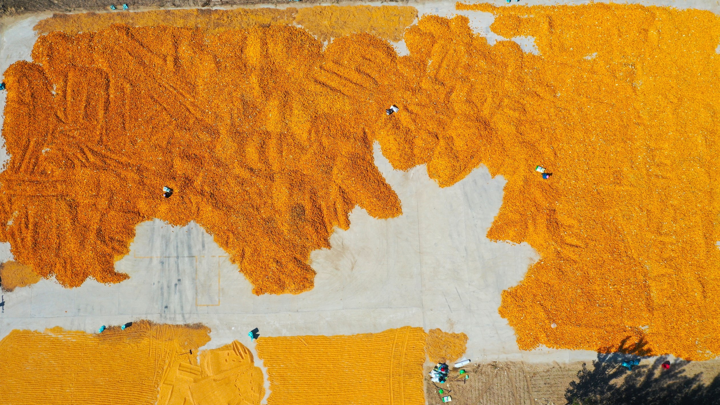 图1:10月15日,鄢陵县马坊镇村民在晾晒玉米和大豆(无人机照片)。