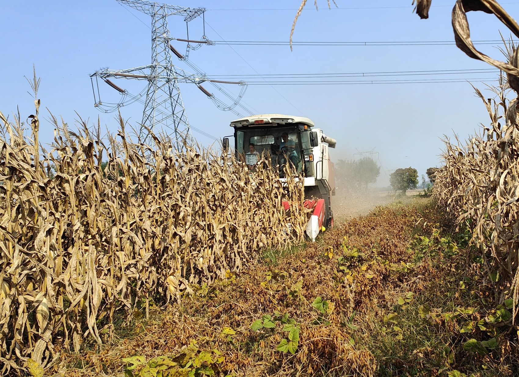 本报讯 (记者 黄增瑞 文/图) 10月13日,在建安区五女店镇“全国种粮大户”赵保献承包的田间,几台收割机有的在收割玉米,有的在收割黄豆,一派繁忙的景象。今年,赵保献利用玉米、黄豆复合种植新技术种植的2000多亩玉米和黄豆获得双丰收。