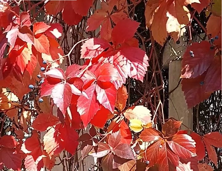 喜光耐寒的火炬树半红半绿。在同一棵树上,有的树叶仍旧墨绿,有的树叶已变成透亮的朱红色,很是奇妙。