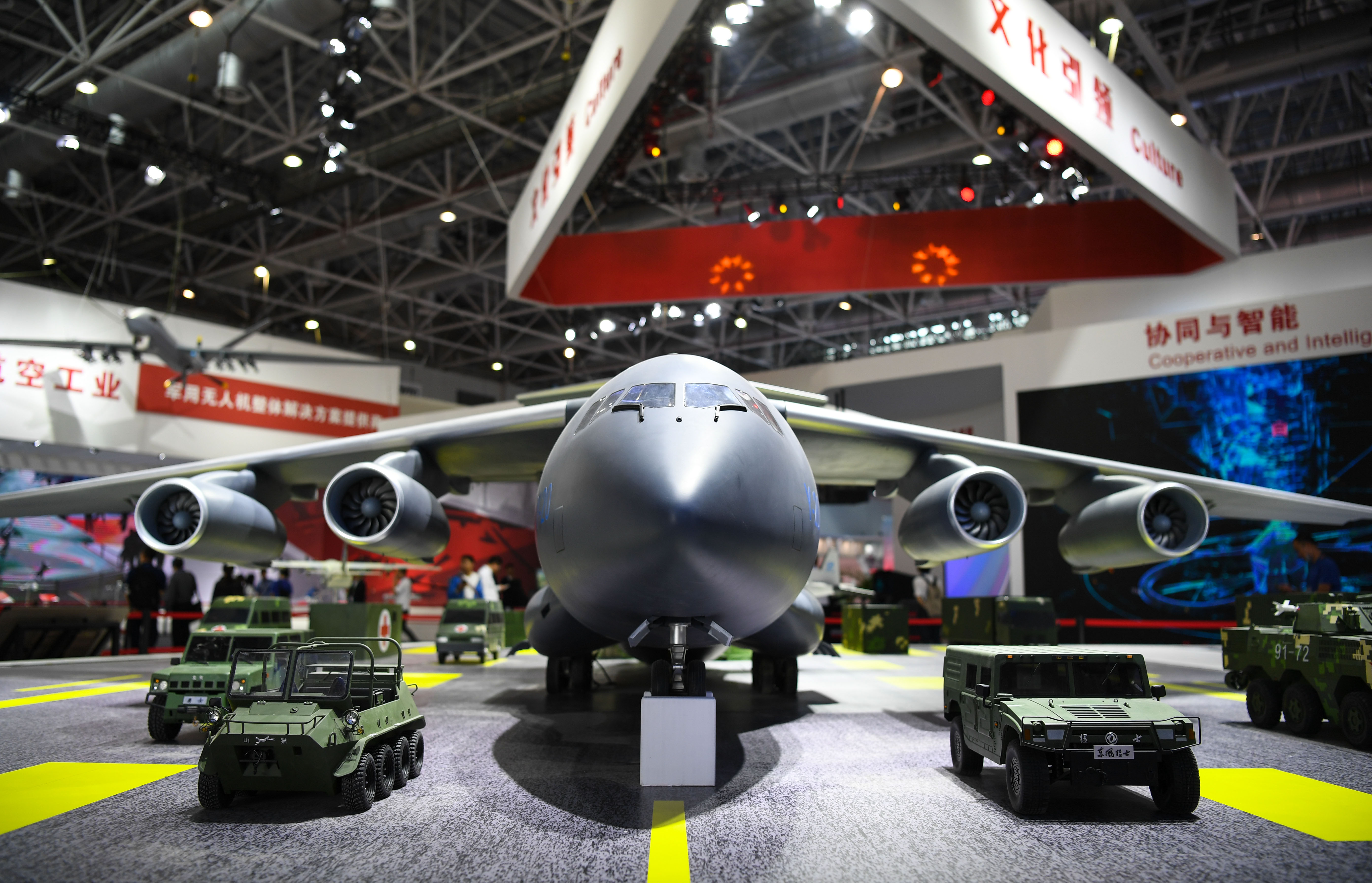 中国航空工业集团展区内展出的运-20模型(11月5日摄)。第十二届中国国际航空航天博览会(简称中国航展)将于11月6日至11日在广东珠海举行,目前准备工作就绪,静待开幕。 新华社记者 邓华 摄