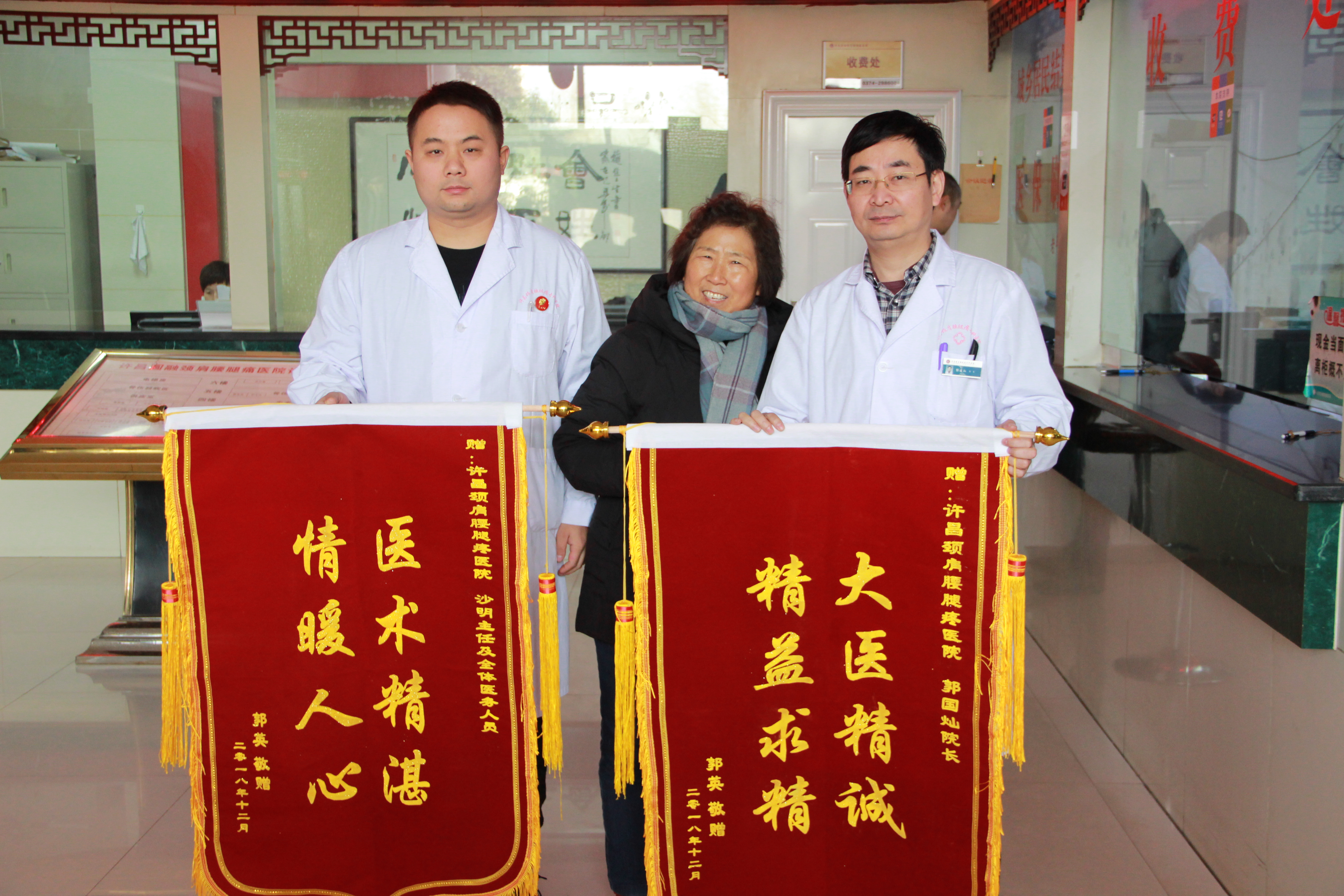 2018年12月28日上午,一名患者从许昌圆融颈肩腰腿痛医院出院后,将两面锦旗送至该院院长郭国灿(右一)和疼痛科主任沙明(左一)的手中,以表达对医护人员的感激之情。 刘地委 摄