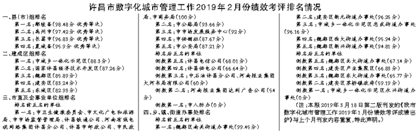 当月,在县(市)组中,鄢陵县以98.48分的成绩位列县(市)组第一名,禹州市、长葛市、襄城县考评成绩均在90分以上,为优秀等次;在建成区组中,市城乡一体化示范区以88.3分的成绩位列建成区组第一名,东城区排名落后;在市直及企事业单位组中,市卫生健康委员会、市文化广电和旅游局等8家单位综合考评成绩为满分,并列市直及企事业单位组第一名。市人防办由于2月份所有案件无人处置,考评成绩为零分,当月排名倒数第一;在乡、镇、街道办事处组中,魏都区南关街道办事处排名第一,市城乡一体化示范区永兴街道办事处排名倒数第一。