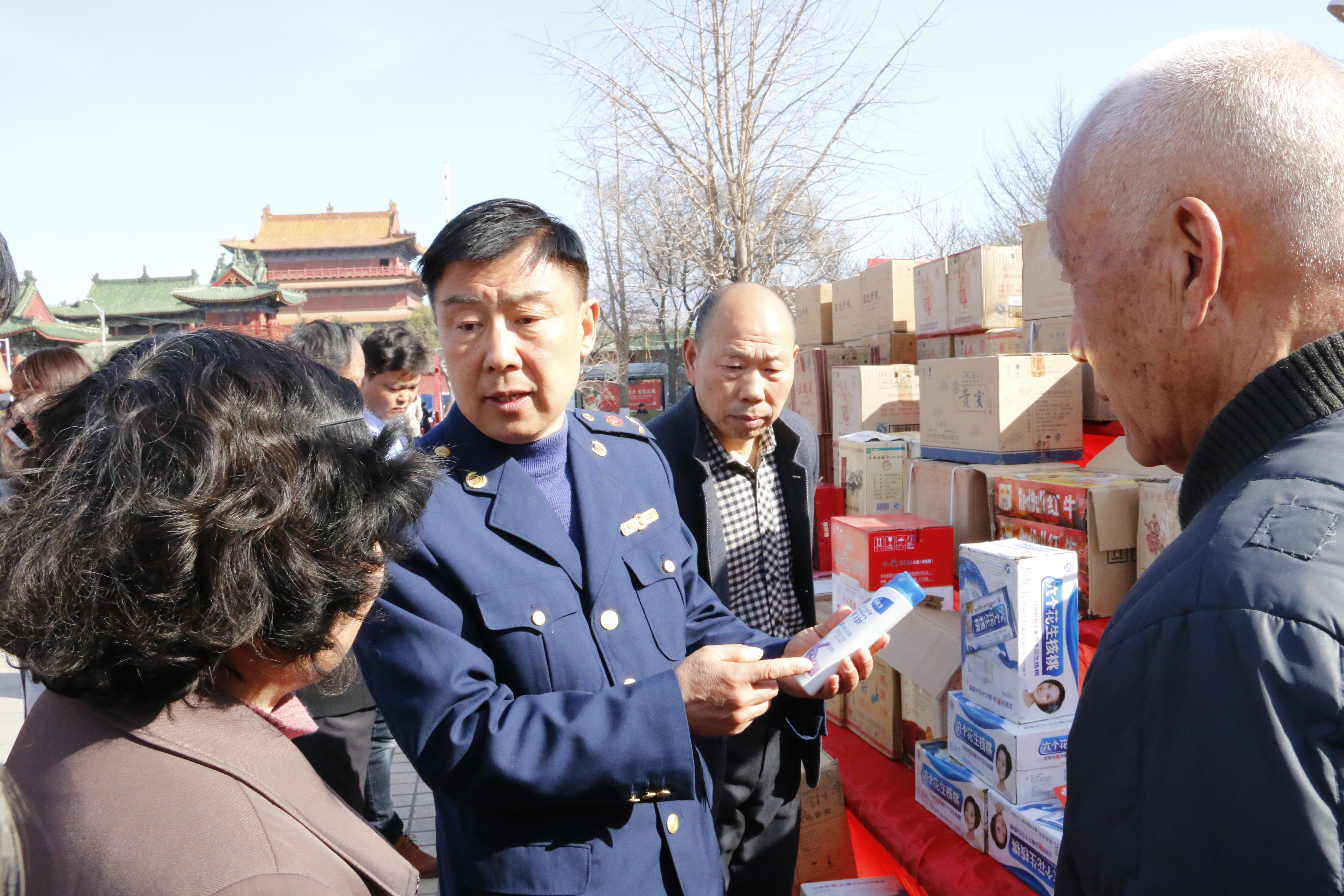 3月15日上午,市市场监督管理局、市消费者协会在市区春秋广场举办宣传活动。图为市市场监督管理局工作人员向市民讲解如何辨认假冒日用品。王培钦 摄
