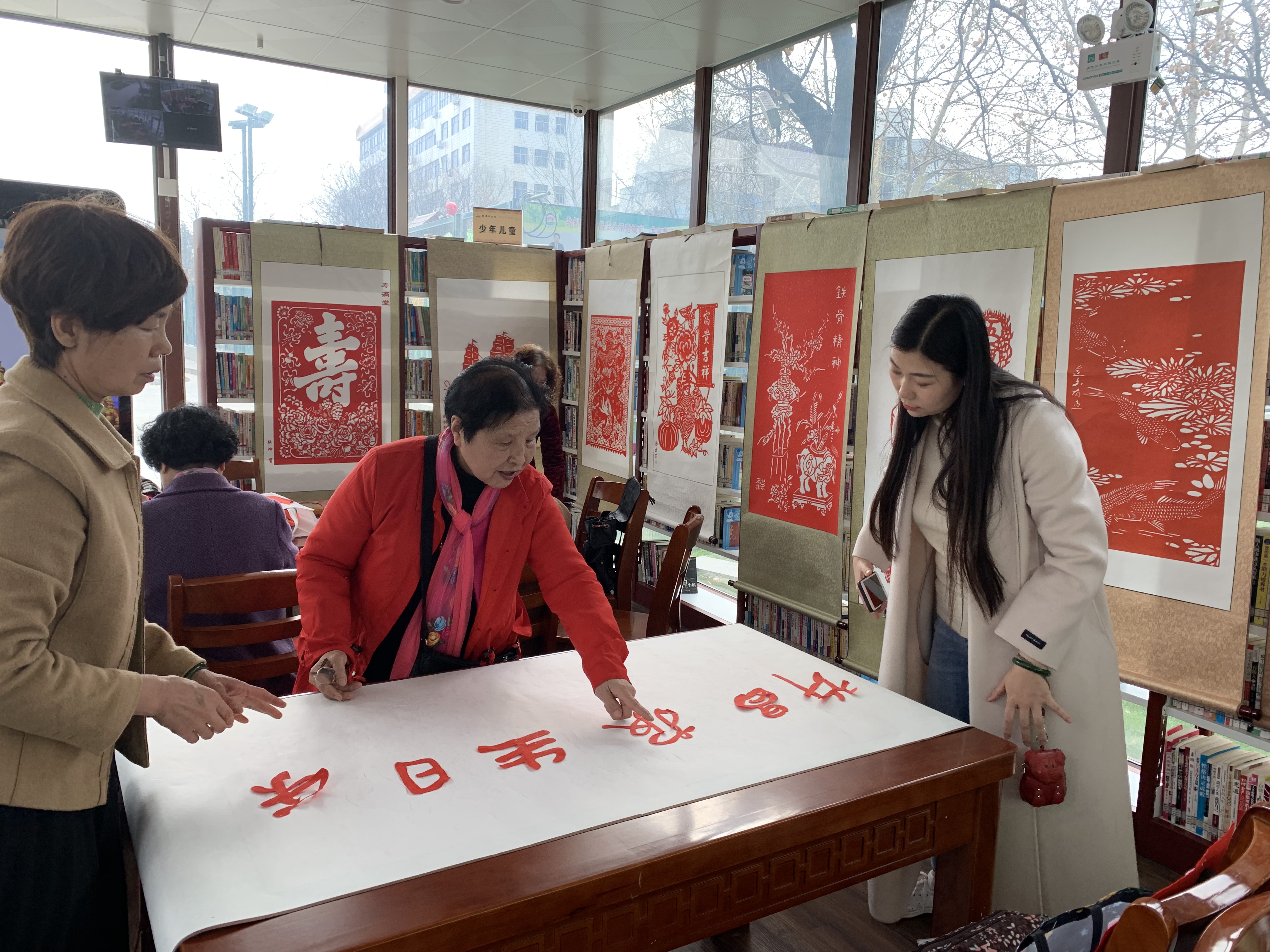为不断丰富群众的精神文化生活,3月18日上午,由魏都区文化广播旅游局、魏都区文化馆、许昌市少儿图书馆主办,许昌市老干部大学承办的“非物质文化遗产交流会”在魏都区智慧阅读空间春秋广场站举行。图为来自许昌市老干部大学的老师们在为大家展示剪纸艺术。 李珊珊 摄