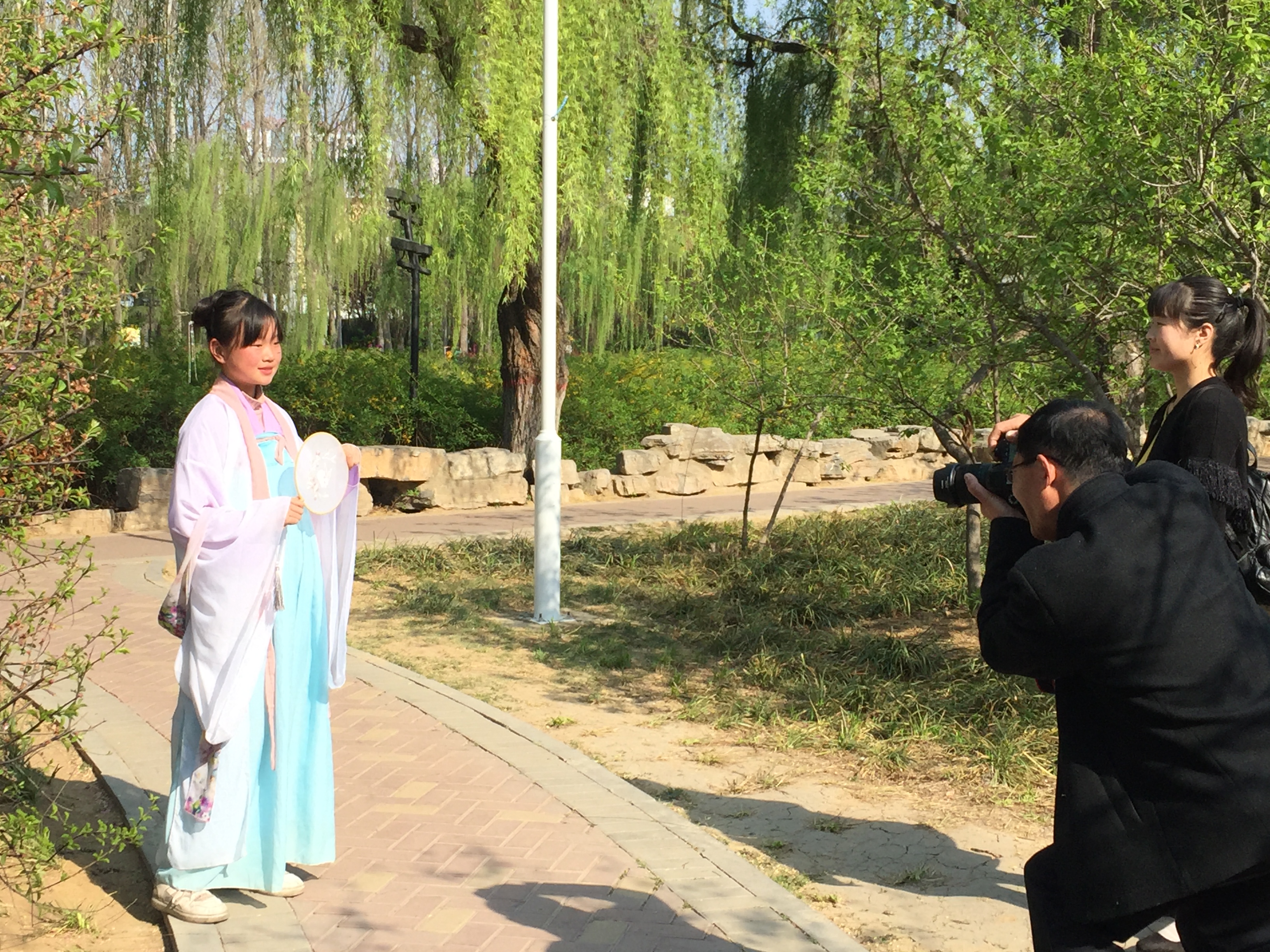 阳春时节,市区清潩河畔,草木吐绿,春风煦暖,百花绽放,景色宜人。图为昨日游人在河畔拍照留念。 冯子建 摄