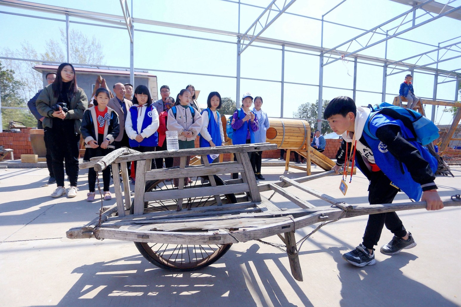 近日,由禹州市盛田农业举办的传统农耕文化体验游异常火爆。前来盛田农业生产基地踏青游玩的游客可以免费参加推独轮车、剥玉米、除草、挖野菜等竞赛活动,在快乐体验中学习传统农耕文化,优胜者还可获得盛田农业生产的粉条、酸辣粉、腐竹等有机产品。图为游客在体验推独轮车。吕超峰 安洪欣 摄