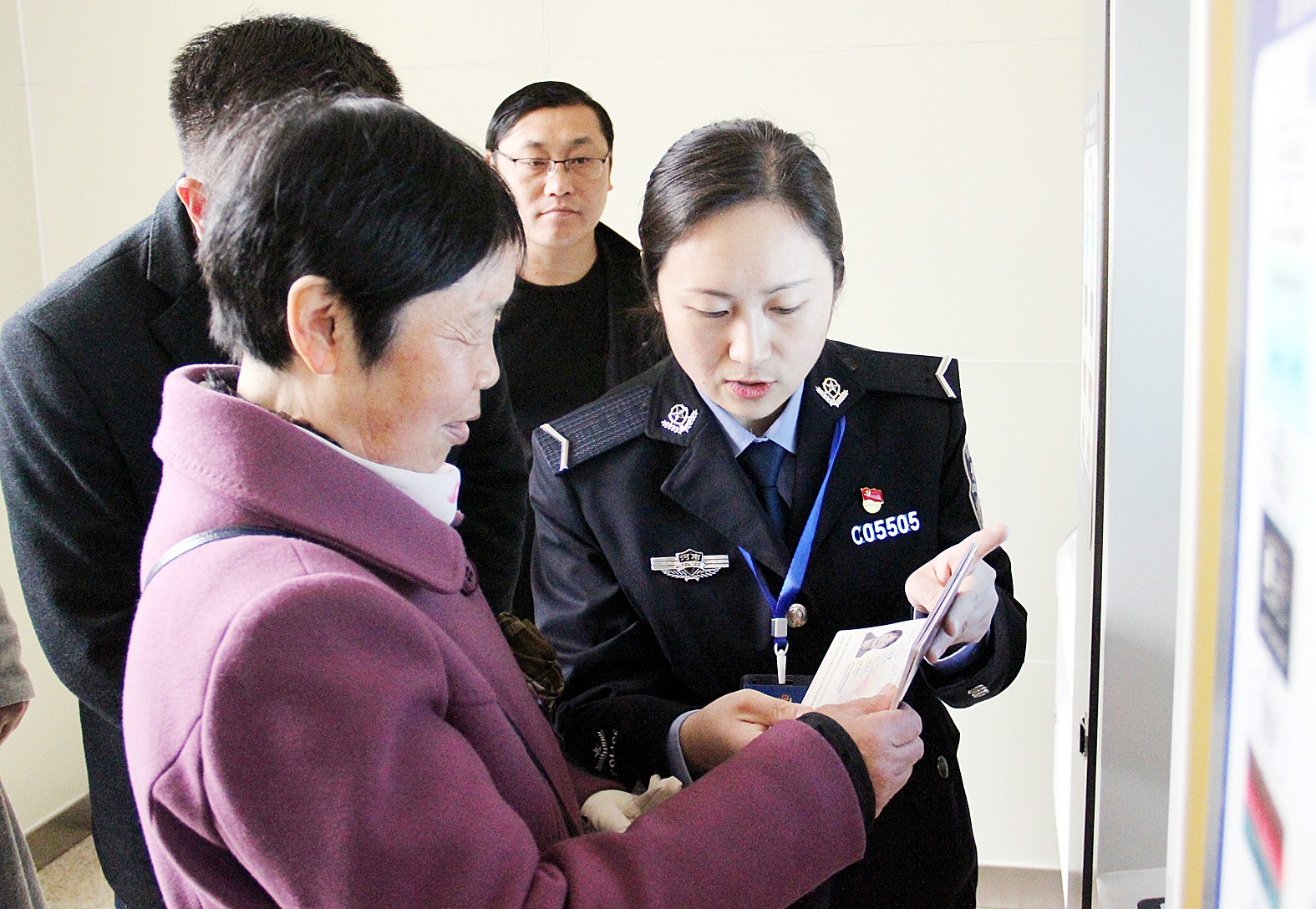 当天上午许昌市公安局治安和出入境管理支队出入境管理大队民警在24小时自助办证服务厅内用自助取证机帮群众办理业务的场景。该大队近年来不断提升服务水平,先后荣获“全国公安机关爱民模范集体”“全国‘五一’巾帼标兵岗”“全国‘三八’红旗集体”等称号30余个。