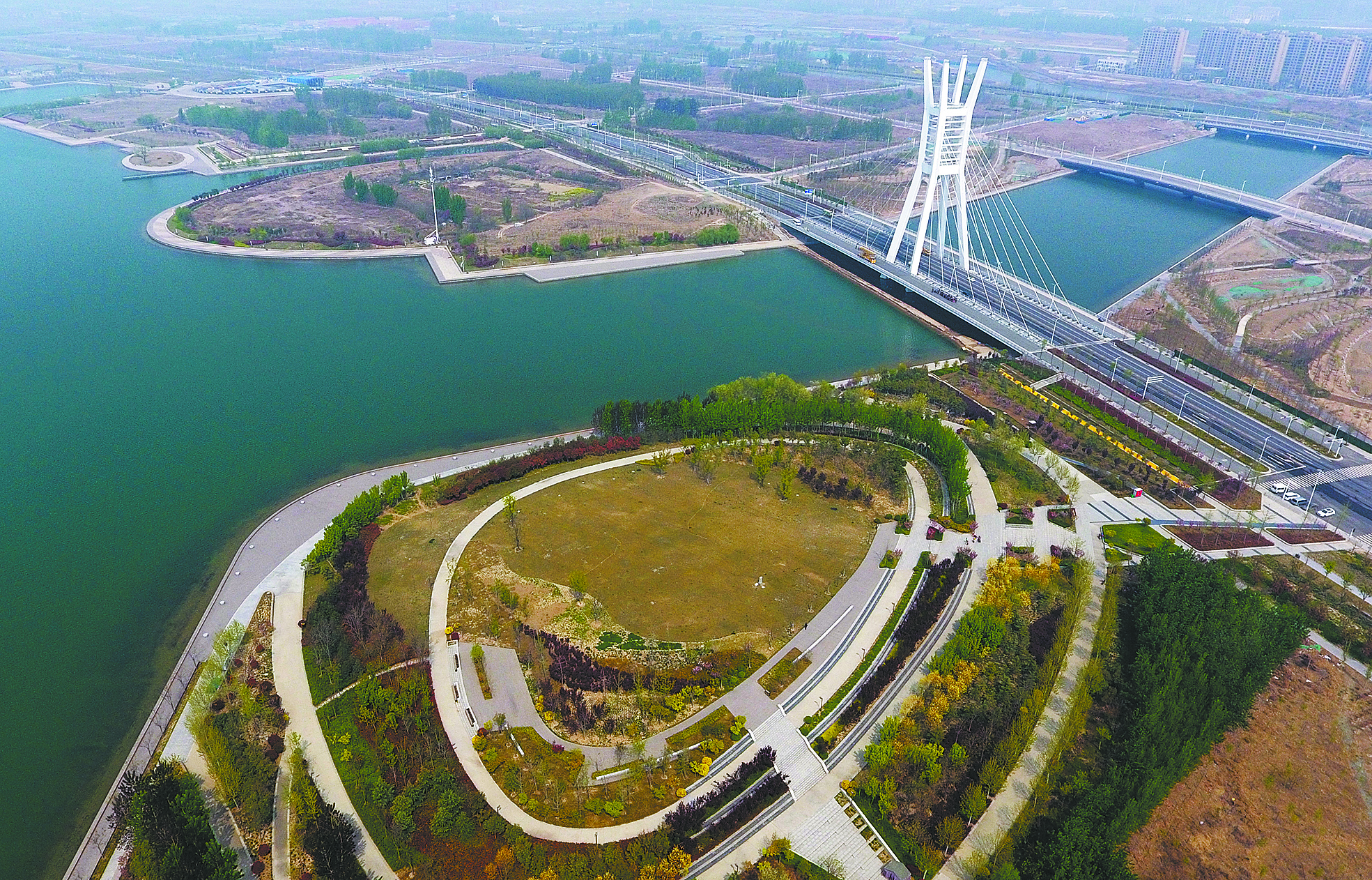 近日,记者使用无人机拍摄到的郑州市北龙湖附近的绿道。 2012年,郑州市启动城市绿道建设,中原西路是建设的第一条路线。目前,郑州市已建成绿道69条(段),总长度3588公里,绿化面积3亿平方米,初步形成了“两环三十一放射”的网络化生态格局。绿道将郑州市区、县(市)、乡镇相互连通,把公园、游园、郊野公园、风景区、博物馆串联成线。 新华社记者 李嘉南 摄