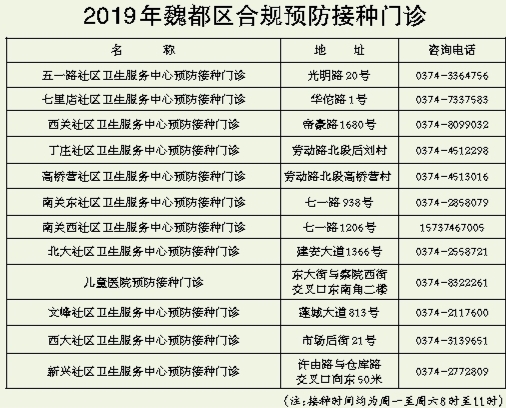 目前,魏都区拥有12个预防接种门诊(名单附后)和10个产科接种点,所有接种门诊面积均在80平方米以上,达到省级标准,并建成6个省级示范接种门诊、6个市级规范接种门诊。