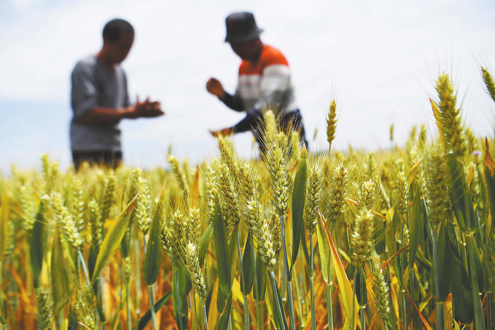 5月20日,在安徽省亳州市谯城区十河镇西关村的麦田里,村民在查看小麦的生长情况。