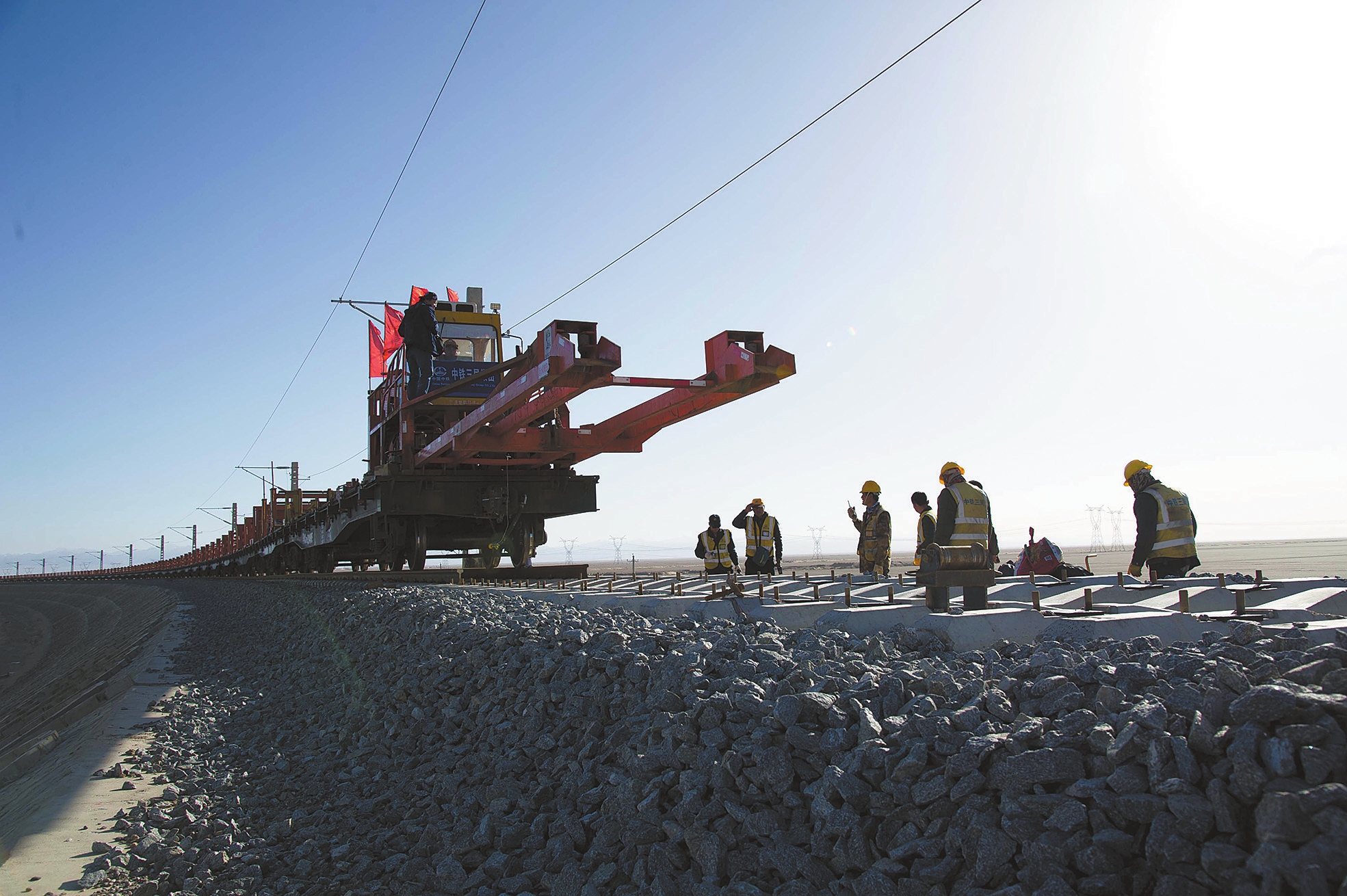 6月15日上午,长约500米的最后两根铁轨,在甘肃省酒泉市阿克塞哈萨克族自治县境内的甘青花海子接轨点与青海段正式接轨,敦煌至格尔木铁路铺轨工程全面完成。敦格铁路线路北起敦煌火车站,南至格尔木站,全长约616.79公里,设计时速120公里,是连通新疆、青海、甘肃、西藏四省区的一条最便捷通道。 新华社发(高宏善 摄)