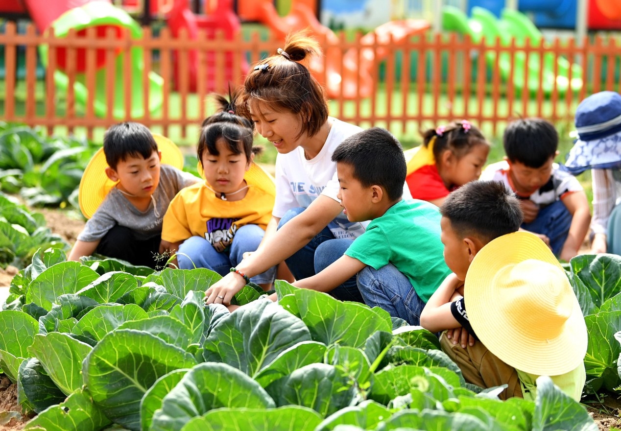 6月17日,乐亭县大相各庄乡幼儿园老师在劳动实践基地的小菜园里给孩子们讲解甘蓝菜的生长过程。近年来,河北省乐亭县依托农业优势,把“农耕教育进校园”作为开展中小学、幼儿园特色教育的重要举措,让孩子们在亲近自然、体验农耕中增长知识、养成热爱劳动的习惯。 新华社记者 杨世尧 摄