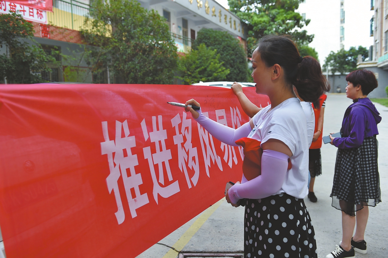 8月5日下午,魏都区游园社区联合市档案局志愿者,举办了以“推进移风易俗,树立文明新风”为主题的签名承诺活动。在游园社区党群服务中心,社区工作人员、志愿者和社区居民等纷纷在横幅上签下自己的名字,表示争做文明新风的积极倡导者和自觉实践者。 杨蓓 摄