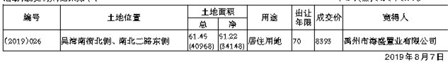经禹州市人民政府批准,禹州市自然资源和规划局于2019年7月24日举办了1宗国有建设用地使用权公开拍卖出让活动,成交1宗,结果如下: 单位:(㎡)、亩、年、万元