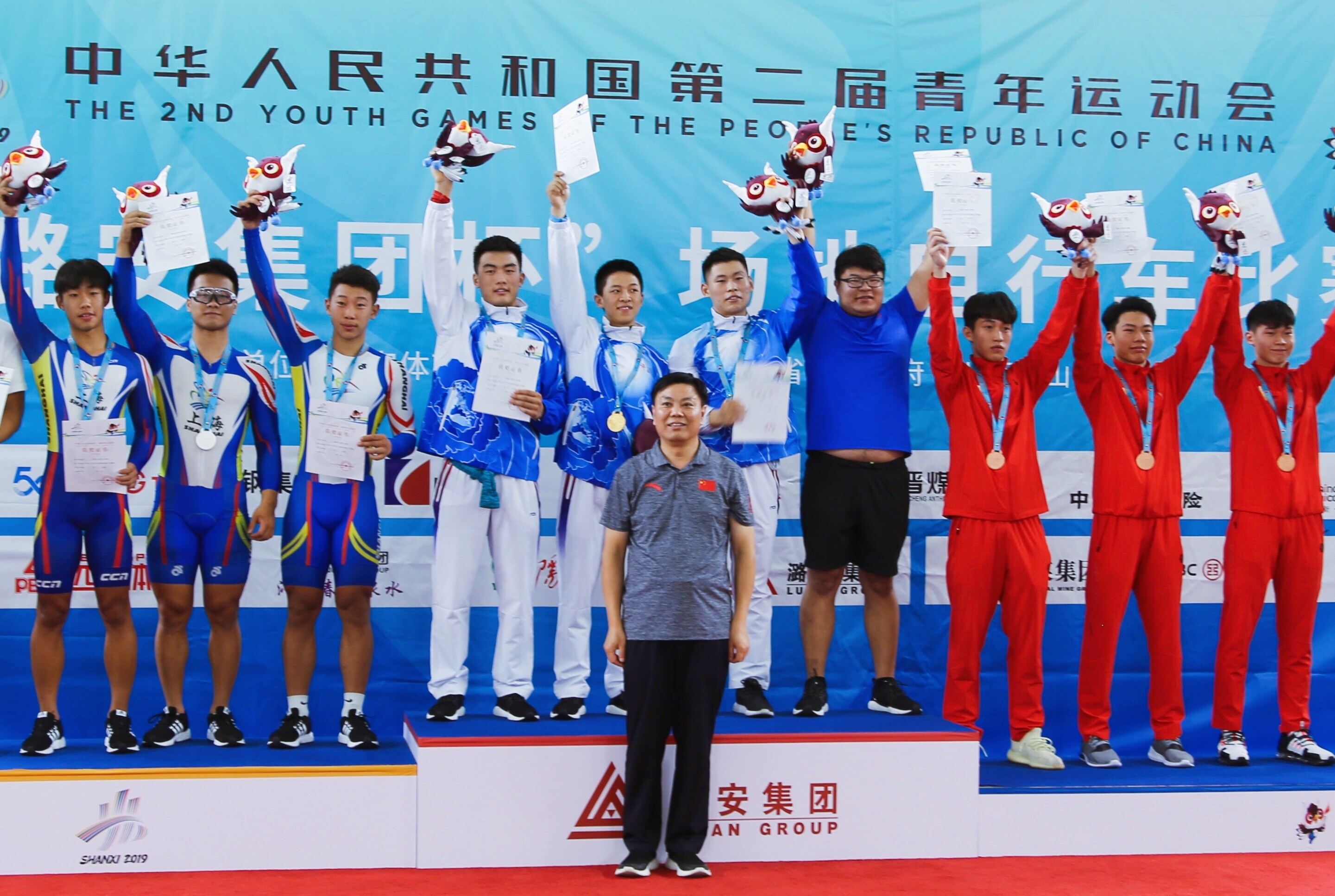 8月7日,第二届全国青年运动会场地自行车体校乙组团体竞速赛在山西省太原市举行,许昌市体育运动学校选派的参赛选手暴天赐、韩鹏杰、薛腾飞团结协作,以45.201∶45.493的成绩完胜上海代表队,为我市摘取“二青会”第二金。图为我市代表队登上冠军领奖台。 寇旭静 摄