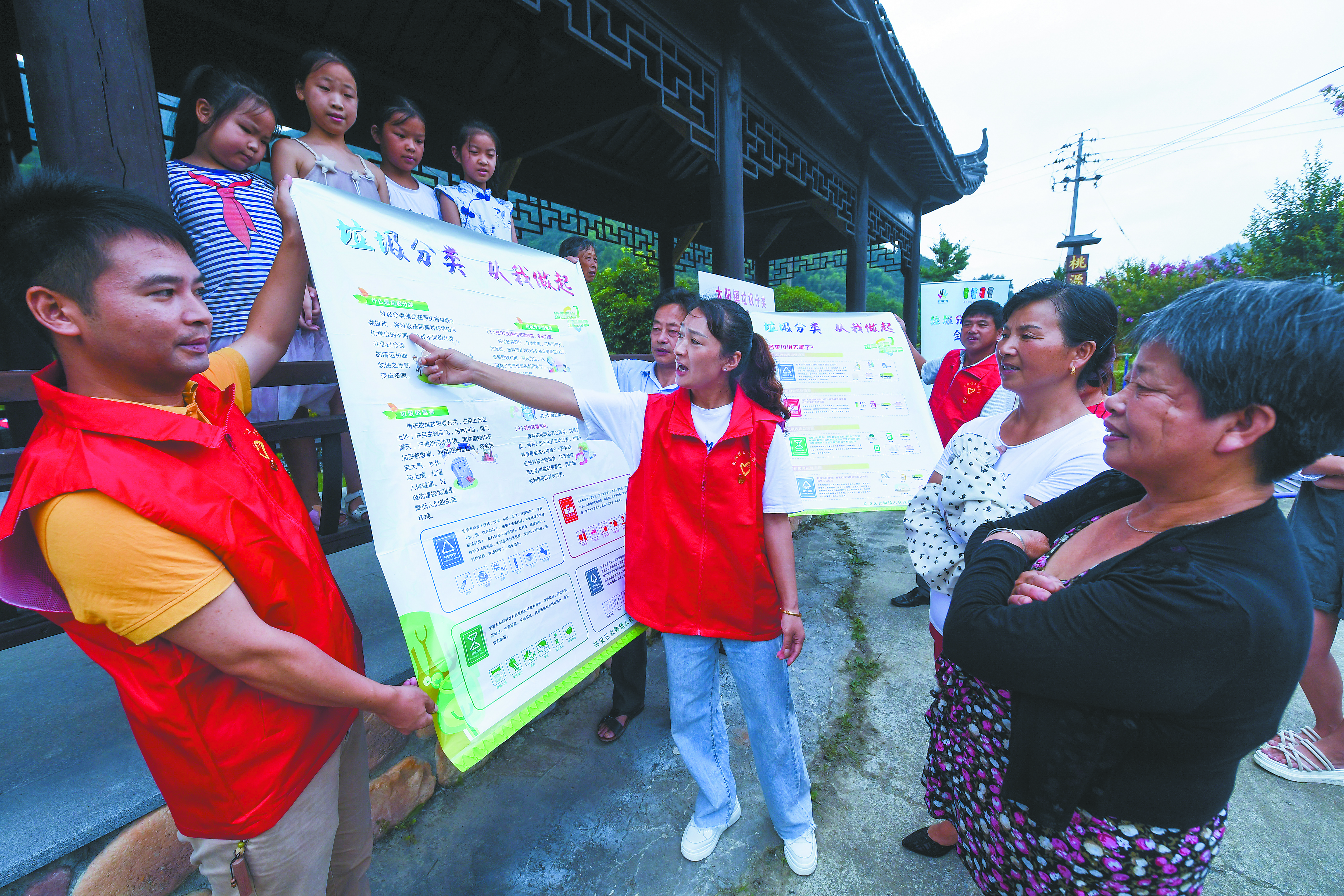 8月8日,党员志愿者在杭州市临安区太阳镇桃源溪村向村民普及垃圾分类知识。近日,各地基层党员志愿者纷纷行动,进社区普及垃圾分类知识。 新华社发