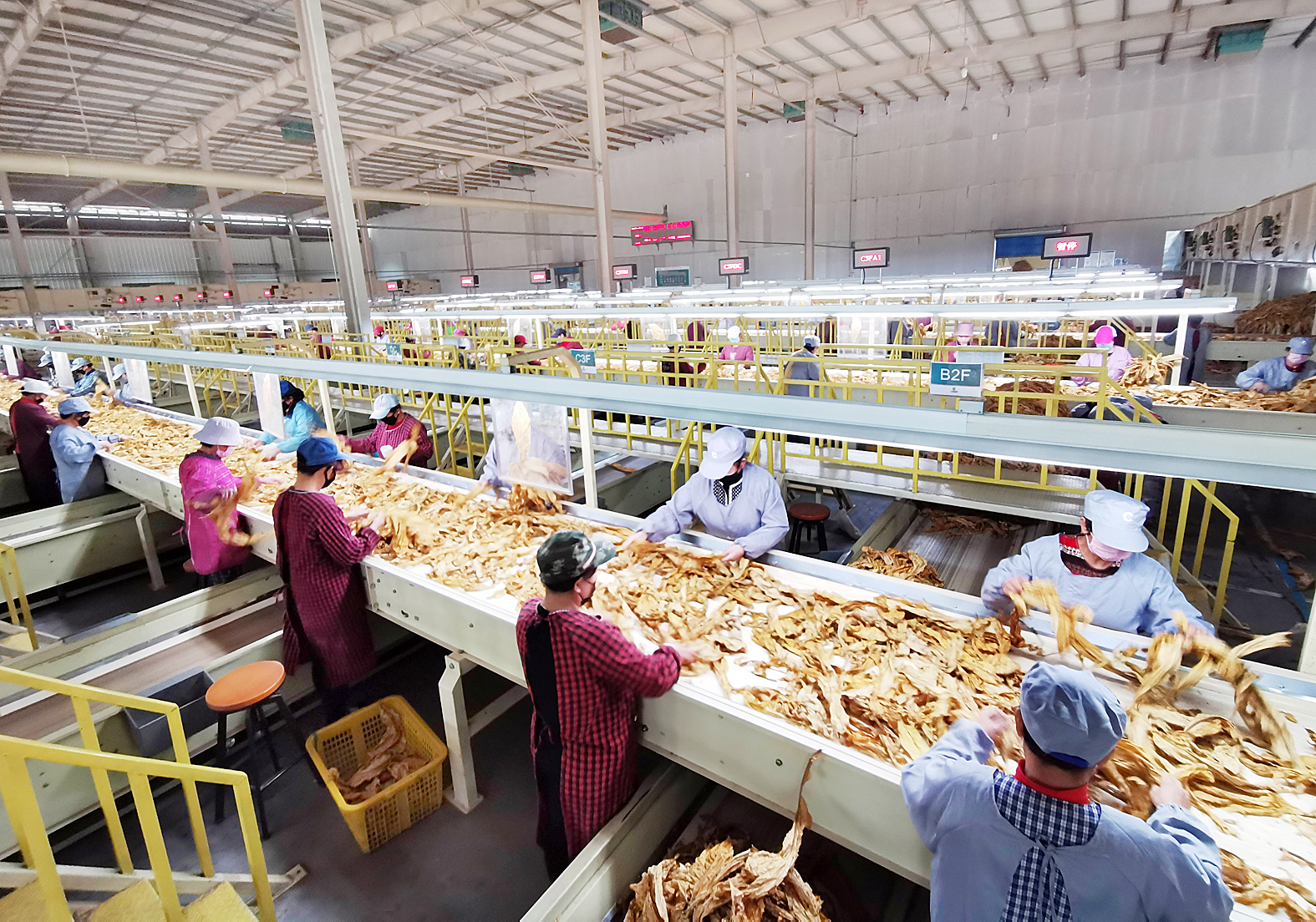 11月13日,天昌国际烟草有限公司天昌复烤厂员工正在机选生产线上忙着烟叶等级分拣。目前,该公司开足马力忙生产,力争今年年底前完成70万担烟叶复烤任务。 本报记者 乔利峰 摄