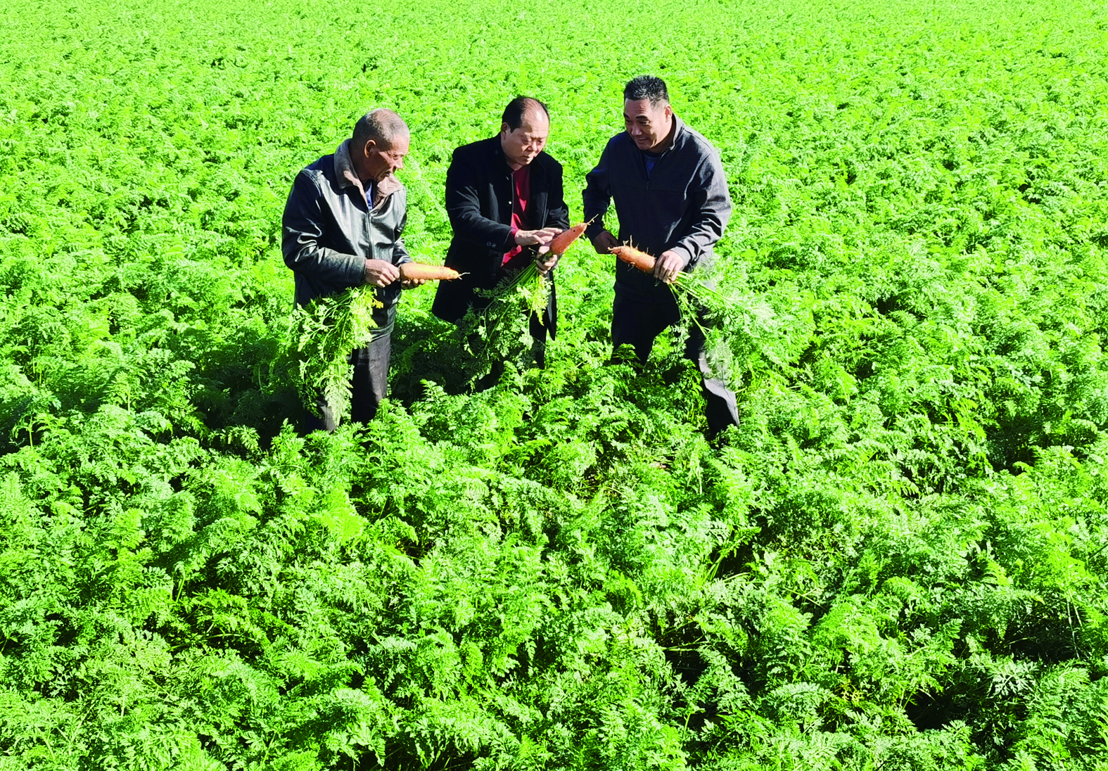 11月14日,在襄城县汾陈镇吕庄村胡萝卜种植基地,技术人员和种植户一起查看胡萝卜长势。目前,该镇以党建为引领,发展胡萝卜规模种植1000多亩,助力乡村振兴,让当地群众在家门口实现脱贫致富。本报记者 乔利峰 通讯员 邓富洲 摄