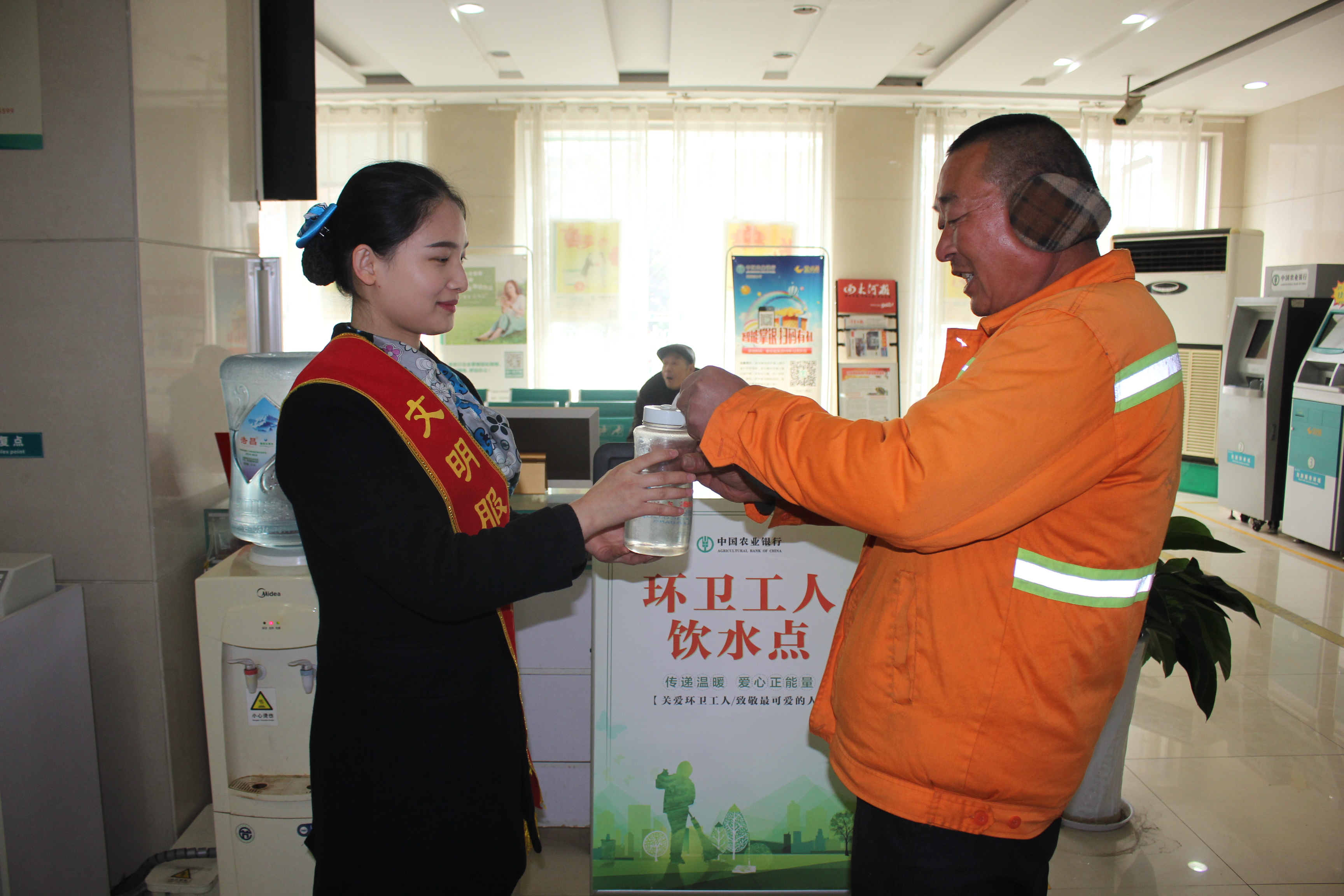 冬至临近,农行魏都支行为环卫工人送温暖,在各营业网点设立爱心驿站,解决环卫工人饮水难问题。 王博元 摄
