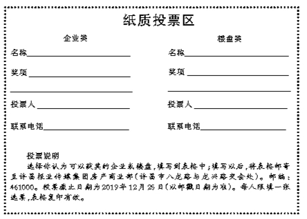 “2019年度许昌地产总评榜”评选采用网络投票和纸质投票两种方式进行,市民可通过填写报纸选票参与评选,为自己信赖的企业、楼盘投上一票。信件投票截止日期以报纸公布的日期为准。