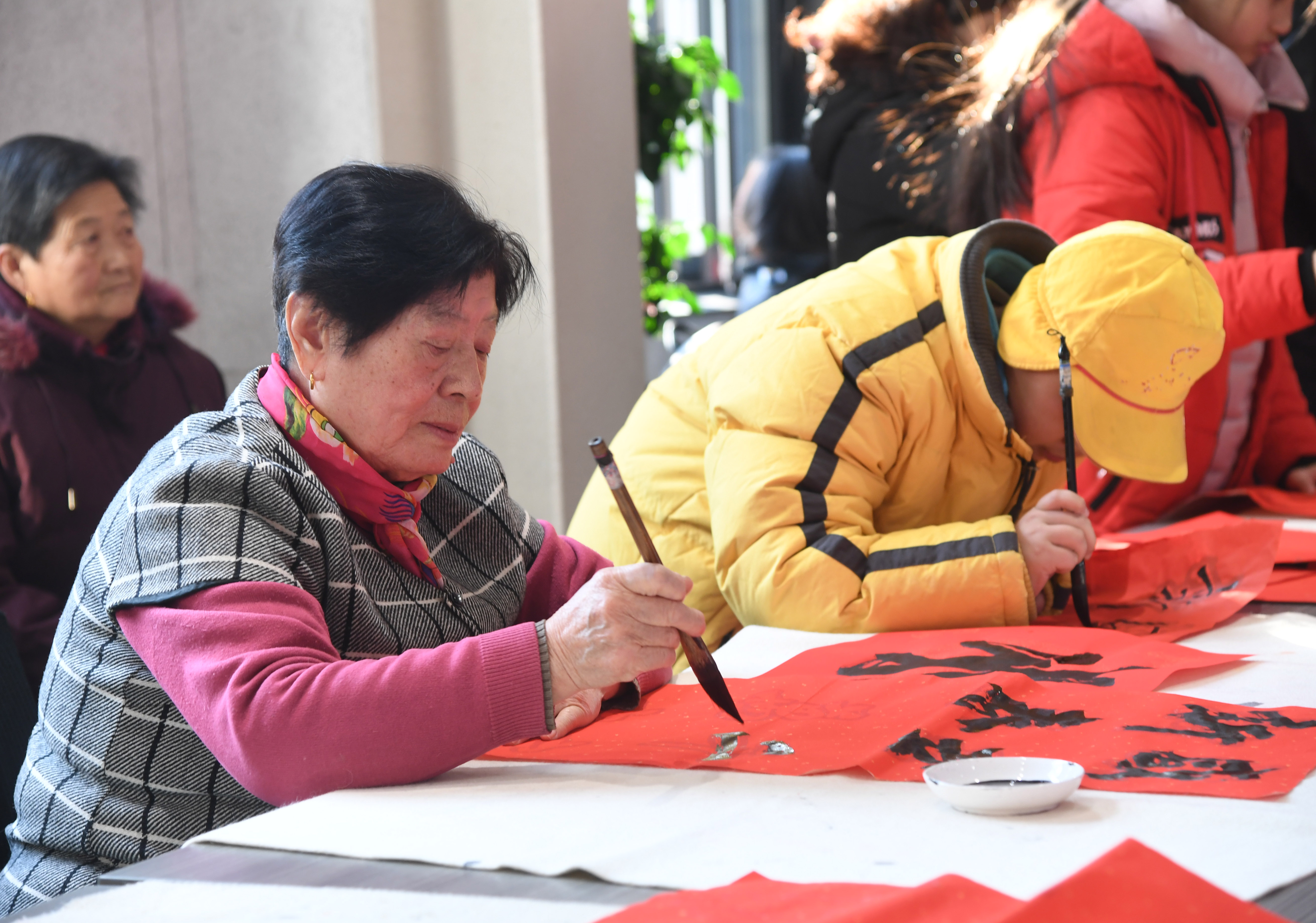二月二十一日,参加活动的学院路街道居民在写春联。 当日, 来自北京市海淀区学院路街道的二百余名居民来到二里庄社区服务中心写春联、送福字,感受中国传统文化魅力,共同迎接新春佳节的到来。 新华社发(任超摄)