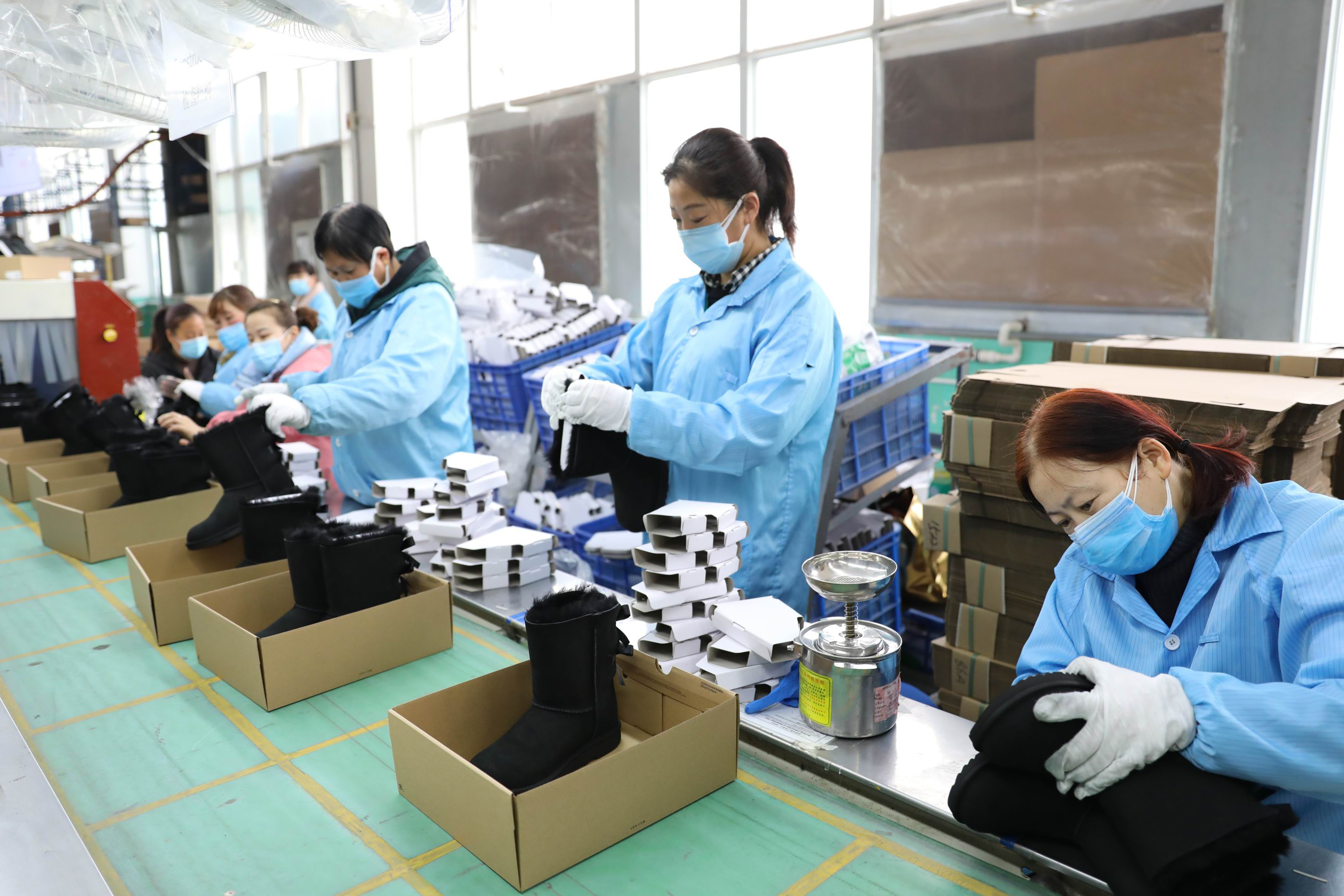2月27日,位于襄城县智能产业园的瑞翔鞋业有限公司员工正在生产线上忙碌。目前,该公司在做好疫情防控的前提下,加紧复工,释放产能,赶制出口到美国的50万双雪地靴订单产品。 本报记者 乔利峰 摄