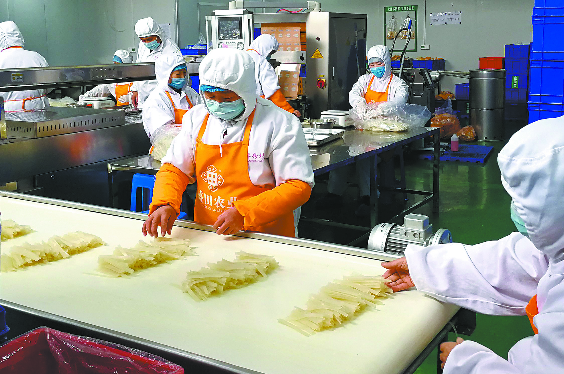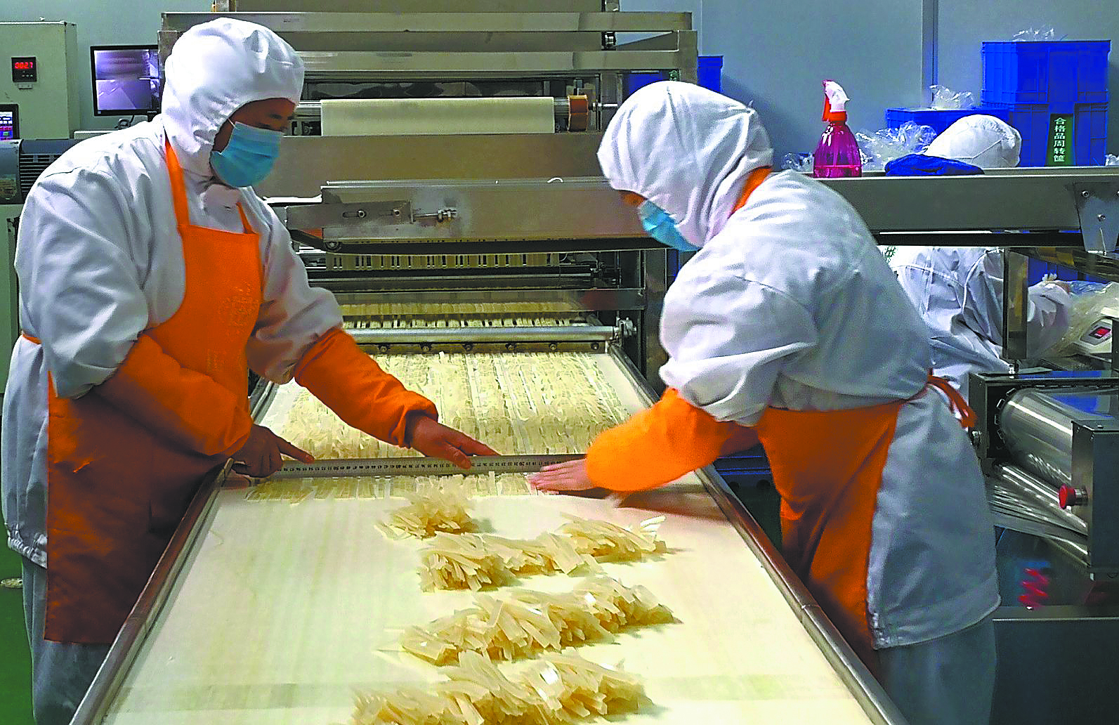 3月6日,禹州市盛田农业生产车间内,员工正在包装许昌胖东来、小天鹅火锅、永辉超市的订单粉条。在2月份新冠肺炎疫情防控的关键时期,盛田农业将客户预定的1200余箱酸辣粉和禹州红薯粉条捐给了禹州市城乡防控卡口以及武汉疫区。近期复工复产后,盛田农业在做好员工防护的同时,开足马力生产,保障合同订单,满足市场需求。 本报记者 吕超峰 摄