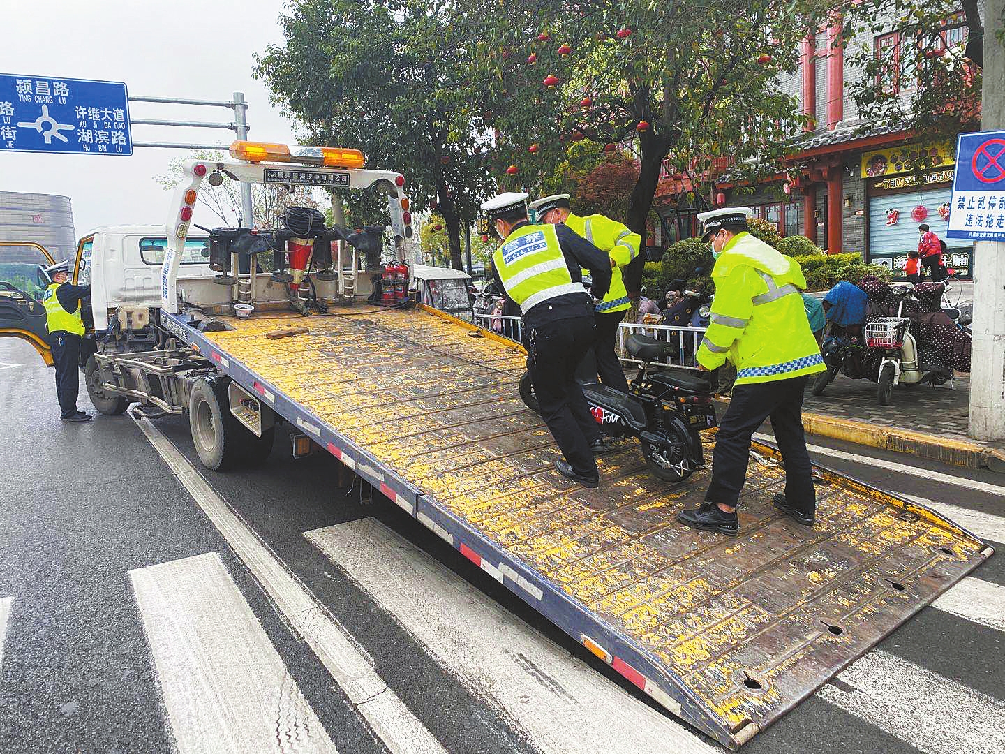 连日来,我市公安交管部门开展文明交通提升行动,对机动车乱停乱放、路口非机动车闯红灯等交通违法行为加大查处力度。图为3月26日交警正在拖运违法车辆。 孔刚领 摄