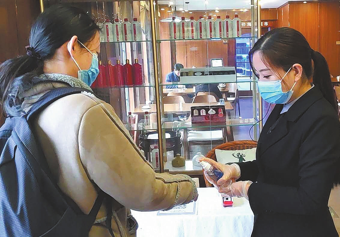 自疫情发生后,市区金港酒店要求员工每日通过微信群上报个人健康状况,复工前安排专人每日到店通风、消毒;复工后员工每日上岗前测量体温,并保留检测记录;要求员工正确佩戴一次性口罩、一次性手套进行服务,员工在服务前后必须用消毒洗手液洗手。