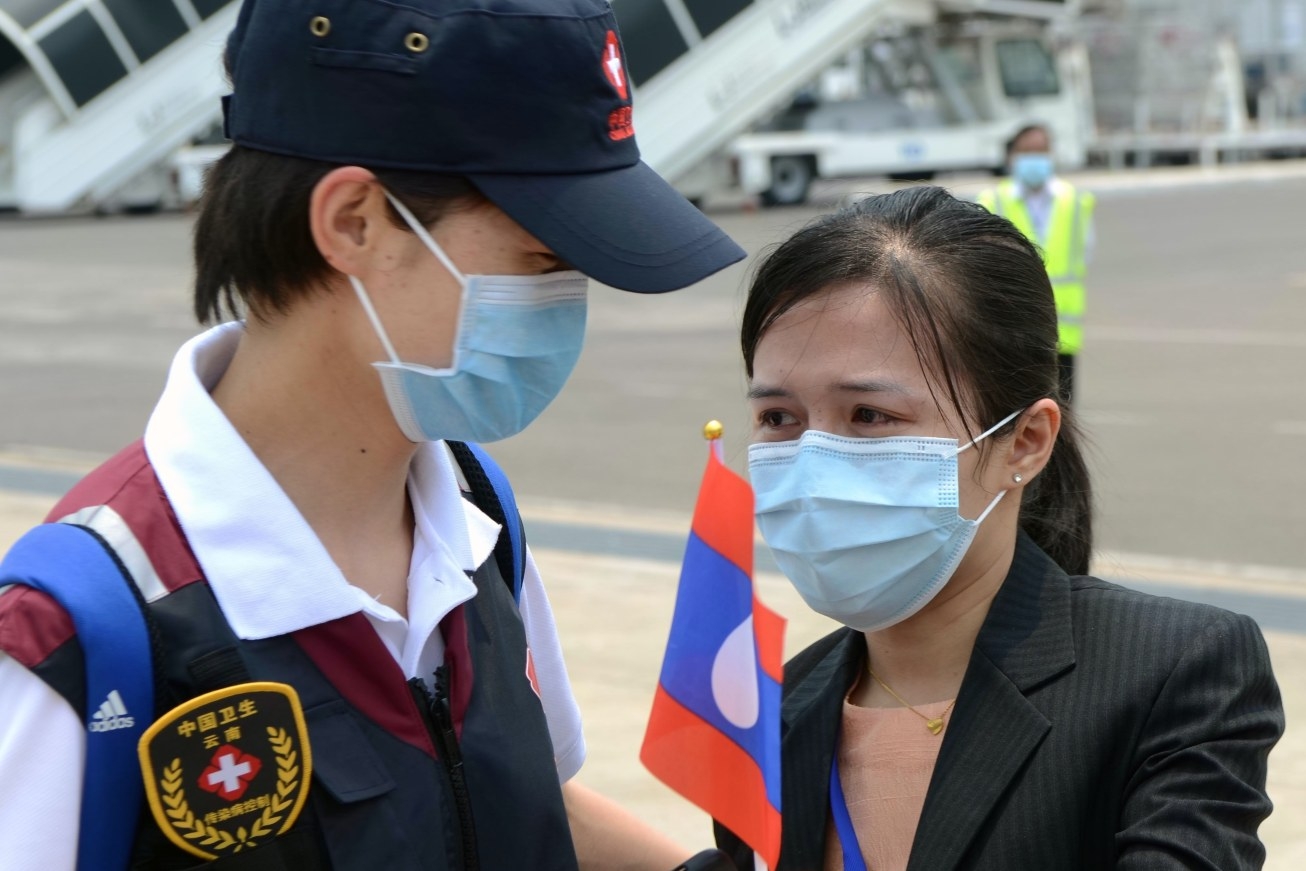 4月12日,在老挝首都万象瓦岱国际机场,老挝卫生部疫情防控官员(右)含泪与中国援老抗疫医疗专家话别。中国援老抗疫医疗专家组12日中午乘坐东航包机启程回国。回国前,中国专家专程看望了老挝首都万象所有确诊新冠肺炎患者。 新华社记者 章建华 摄