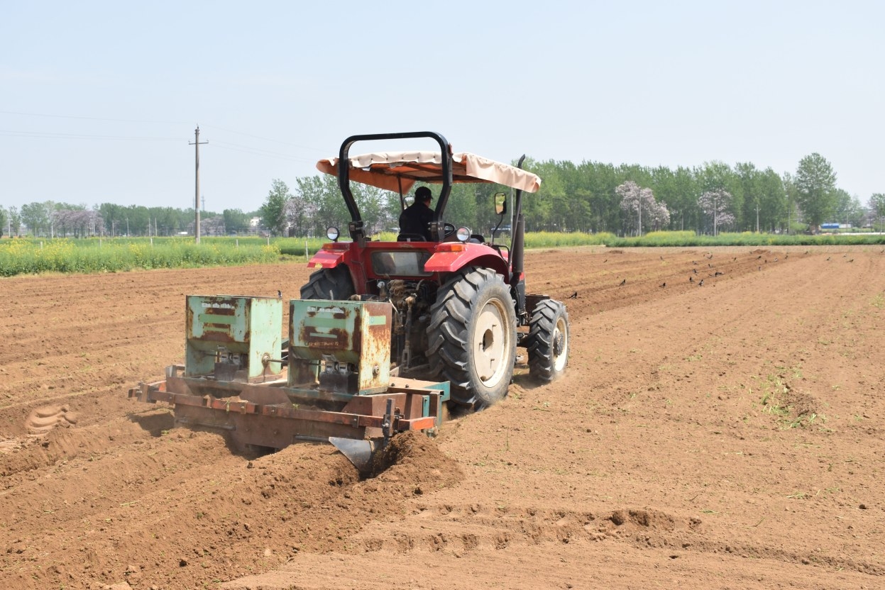 4月18日,在襄城县颍阳镇新杨庄村的烟田里,一辆农机正在一次性完成烟田施肥和起垄。颍阳镇今年种烟面积1.1万亩,随着烟叶大田移栽时节的日渐临近,各村烟田整地起垄正抓紧进行,为烟叶移栽做准备。 本报记者 史晶 通讯员 邓军 摄