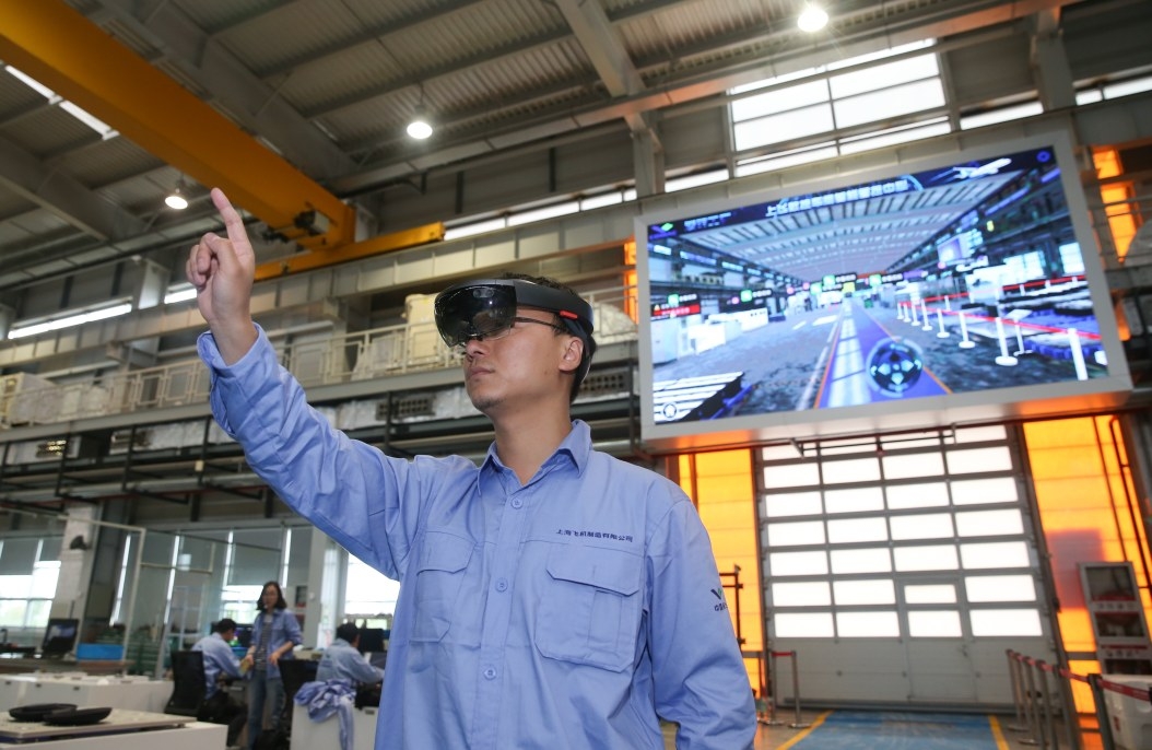 工作人员在中国商飞公司总装制造中心智慧数控车间使用AR眼镜操控虚拟电子屏幕(2018年5月5日摄)。 新华社记者 丁汀摄