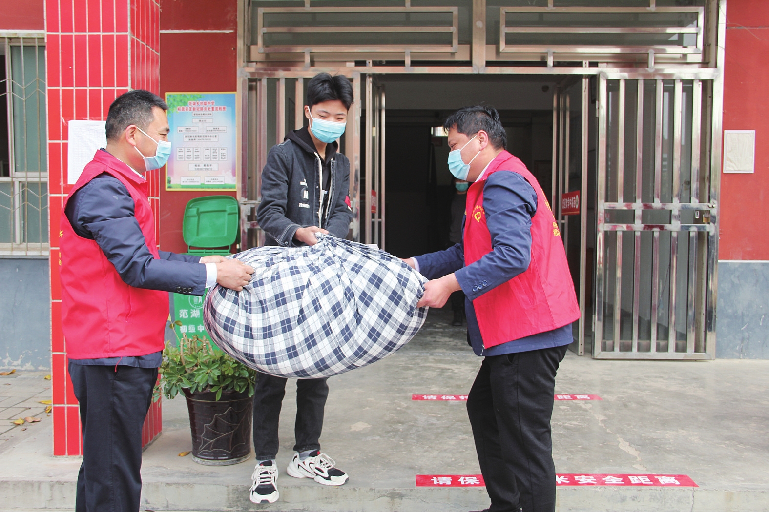 4月20日,襄城县范湖乡党委、乡政府组织机关百余名志愿服务者,来到该乡初级中学,为10个初三班级738名学生测量体温、消毒、发放口罩和防疫手册,并搬运床铺、书籍等,深受师生称赞。 古国凡 赵柯炎 摄