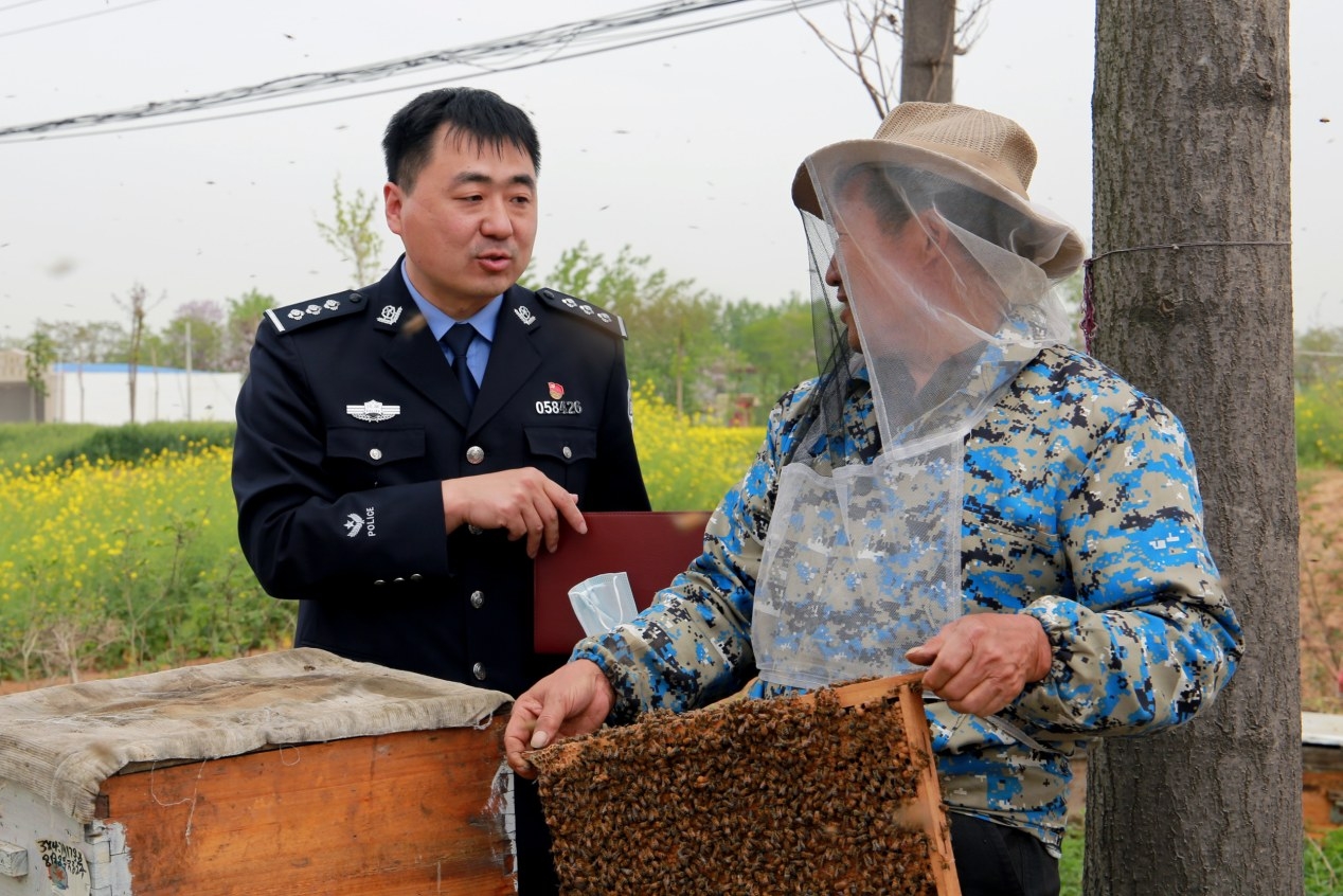 4月16日,襄城县公安局汾陈派出所组织民警深入田间地头,“零距离”向群众普及防骗、防火、防盗等方面的知识,从源头上筑牢安全防线。图为该所民警张晓鸣在襄城县汾陈镇岗杨村向放蜂群众讲解有关知识。 侯海燕 摄