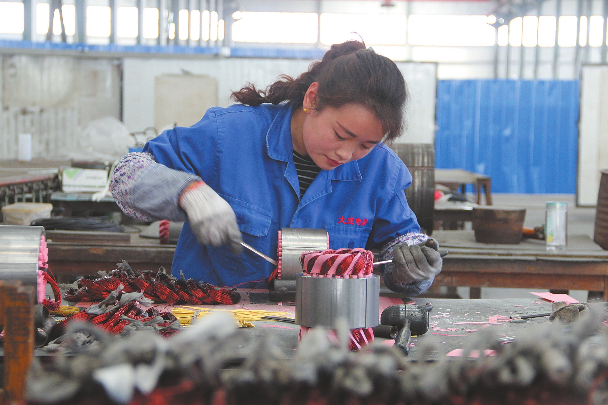 河南许之洲机电科技有限公司拥有8项实用新型专利,借力“互联网+”,推出智慧电机设备管理系统,实现远程监控、控制和数据实时分析等,提前预警,避免故障,使产品和管理智能化。图为4月24日该公司一名工人正在忙碌。 魏东雅 摄
