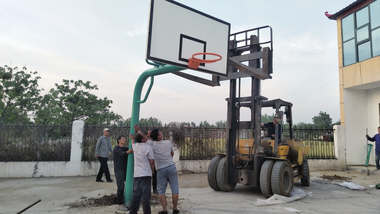 建安区北岸村是省级贫困村。近年来,驻村工作队千方百计协调项目和资金,对村内道路进行了硬化亮化,新建了文化广场,安装了健身器材,全村面貌焕然一新。图为5月14日,北岸村驻村干部和党员正在安装篮球架。武鹏亮 摄