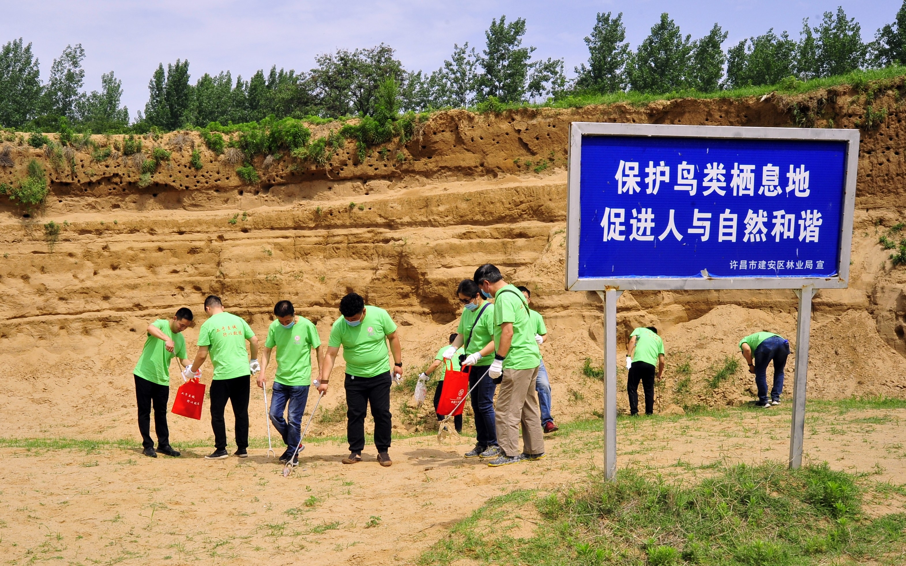 5月16日,工行许昌分行工会40余名志愿者来到建安区榆林乡刘王寨村,清理颍河刘王寨段崖沙燕生活栖息地垃圾,用实际行动诠释了保护生态环境、共建文明城市的青春风采,受到了附近村民的好评。 李晓 摄
