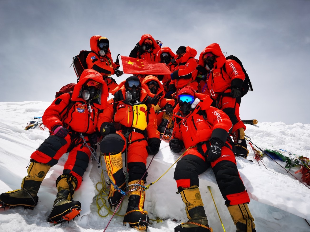 5月27日,2020珠峰高程测量登山队在峰顶合影留念。 5月27日,2020珠峰高程测量登山队成功登顶世界第一高峰珠穆朗玛峰。他们在峰顶竖立觇标,安装GNSS天线,开展各项峰顶测量工作。45年前的今天,中国人首次将觇标带至珠峰峰顶。 新华社特约记者 扎西次仁 摄