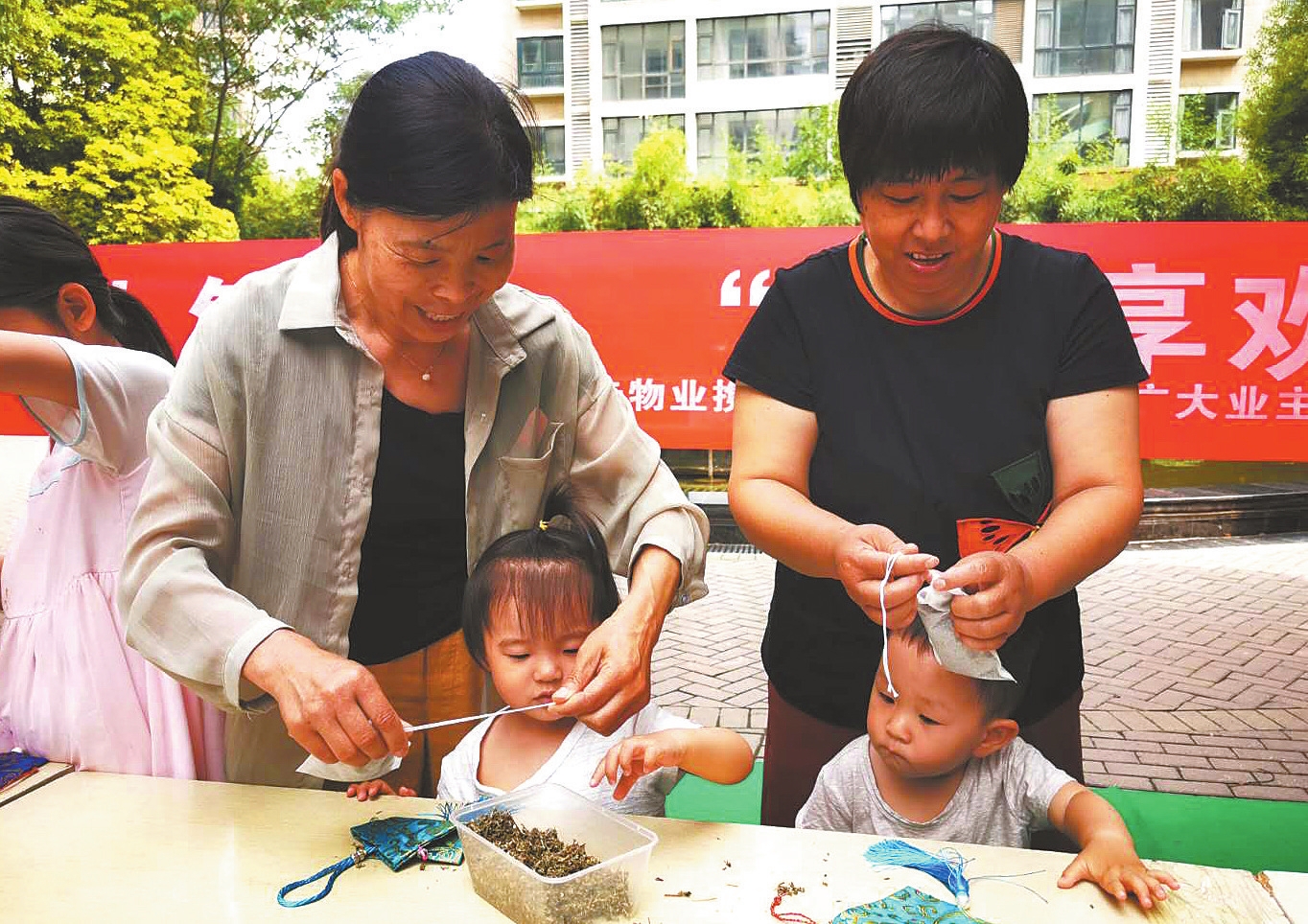 端午节有佩戴艾草香包的习俗。为了丰富小区居民的文化生活,促进邻里和睦,瑞贝卡物业和天下物业服务中心开展了“巧手做香包,暖心和天下”活动。
