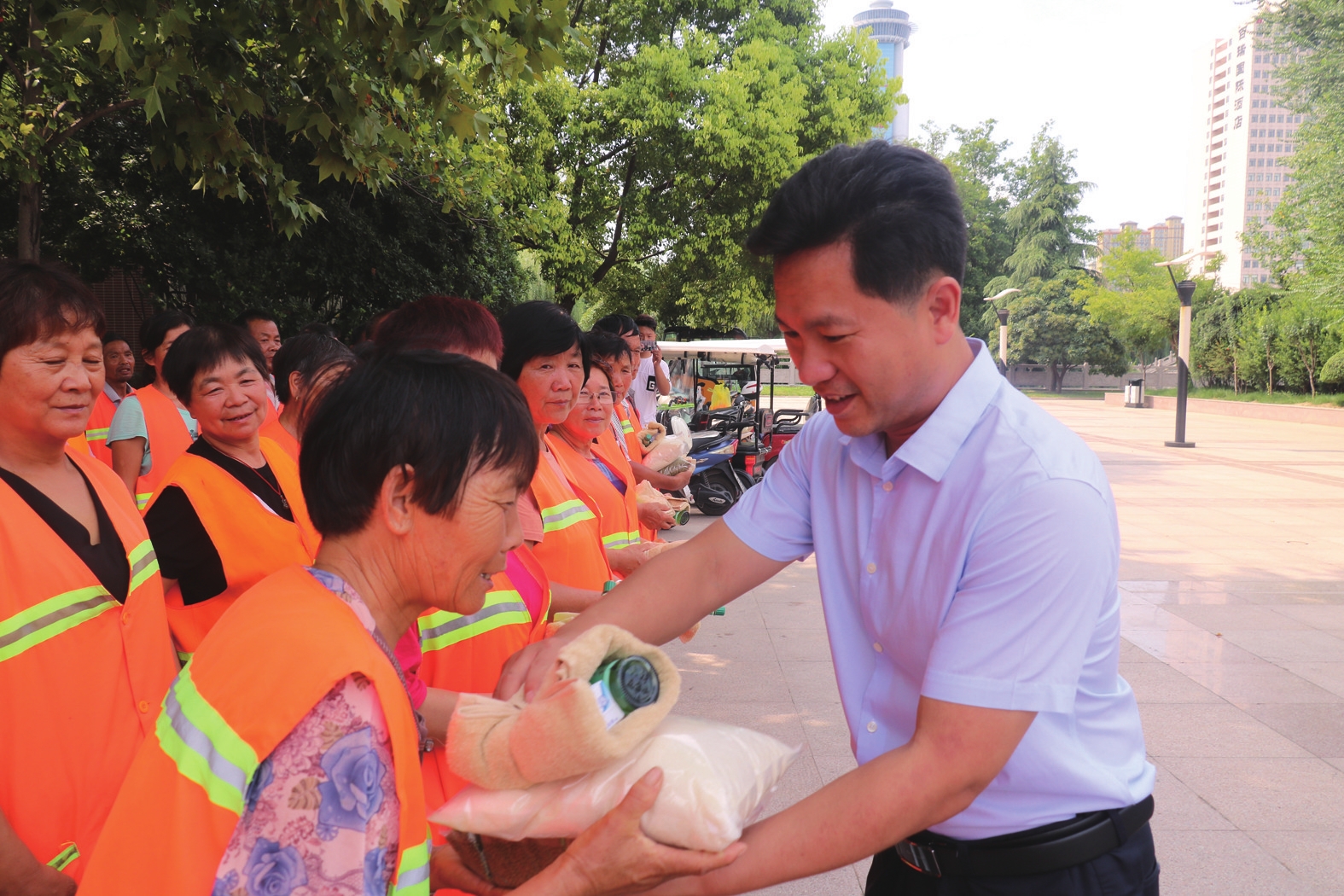 近日,国家许昌经济技术开发区总工会开展防暑降温“送清凉”活动,为坚持在高温一线工作的企业职工、环卫工人发放绿豆、白砂糖、香皂、毛巾、花露水等防暑降温物品。 苏杭 摄