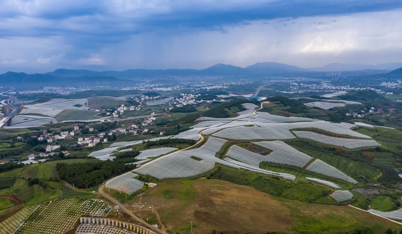 这是8月8日拍摄的昭通超越万亩苹果基地(无人机照片)。 目前,云南省昭通市苹果种植面积近80万亩,推动30多万果农依托苹果产业实现脱贫致富,半城苹果满城香的“苹果之城”正在乌蒙山区奋力崛起。 新华社记者 江文耀 摄