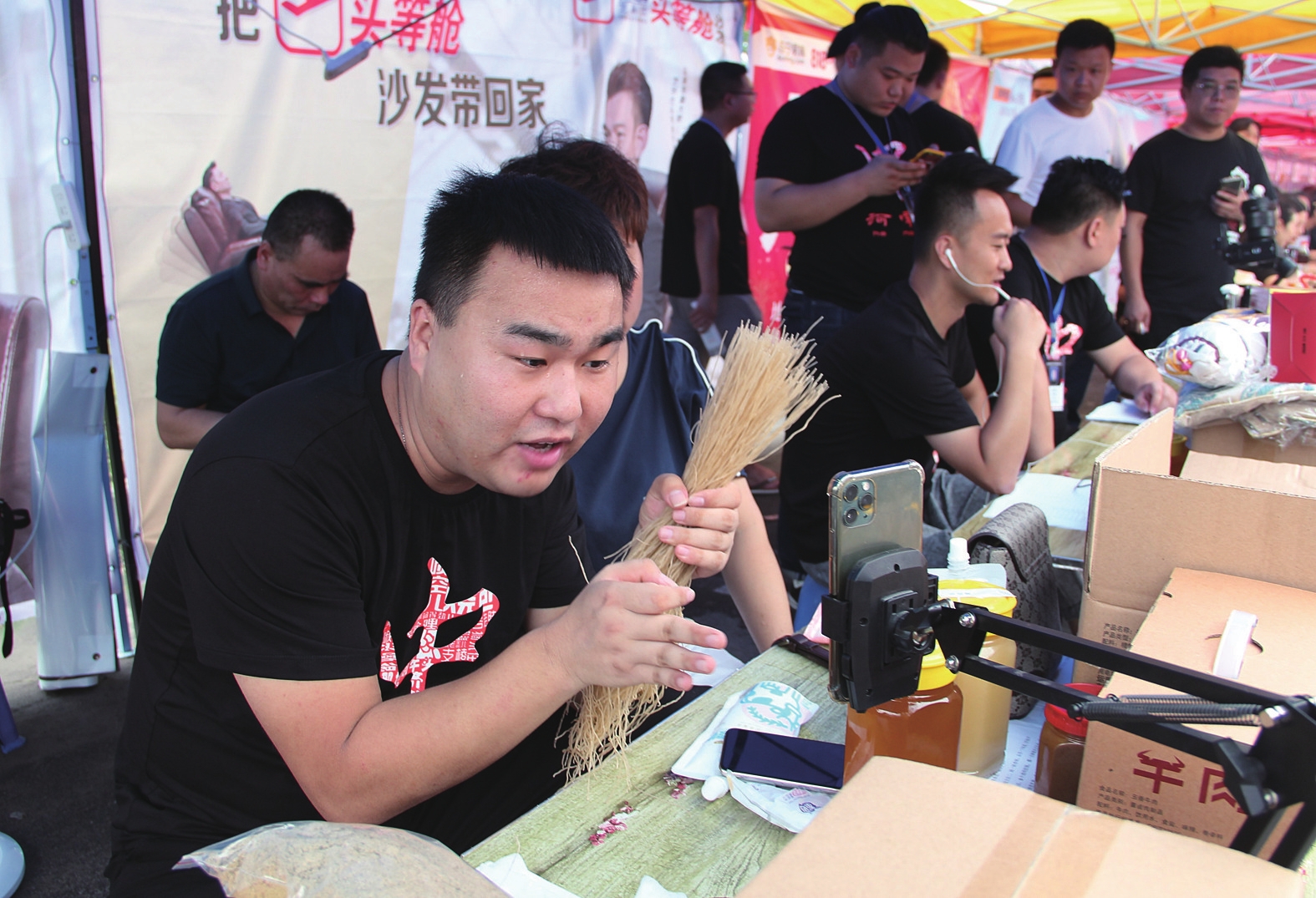本报讯(记者 魏东雅 文/图)“咱家粉条是纯红薯粉条,39.9元3斤,感觉好的话就下单,最后20单啊……”8月6日,在襄城县2020年直播带货暨美食节启动仪式结束后,襄城县本土网红李华在现场开始直播带货。当天,在襄城县万汇龙广场,该县各乡镇筛选的适合展销的优质产品摆满了广场上的摊位,鸭蛋、柿子黄茶、纯手工牛筋面、纯红薯粉条、蜂蜜、芝麻酱等产品吸引了不少市民前来参观、品尝。在广场一侧,30多位网红一字排开,纷纷开启直播,投入到各自的工作中,助力此次活动顺利开展。