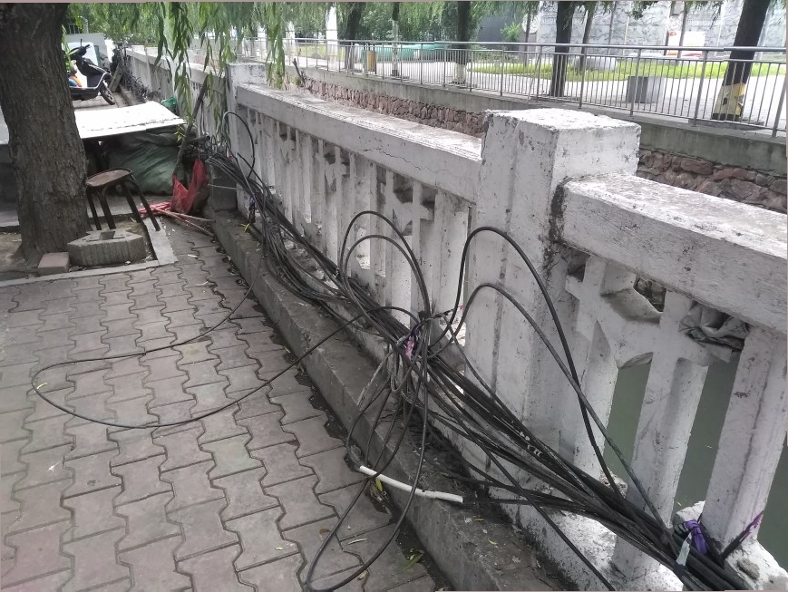 10月13日,记者在市区八一路与五一路交叉口南侧看到,运粮河的护栏上,悬挂着通信电缆,既不安全,又不雅观。且此处垃圾、杂物随处可见,有损城市形象。呼吁电信运营商等有关部门及时处理。 孔刚领 摄
