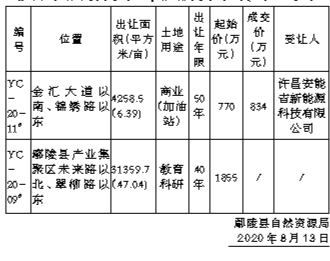河南省自然资源网上交易鄢陵县2020第五批国有建设用地使用权拍卖出让成交结果公示