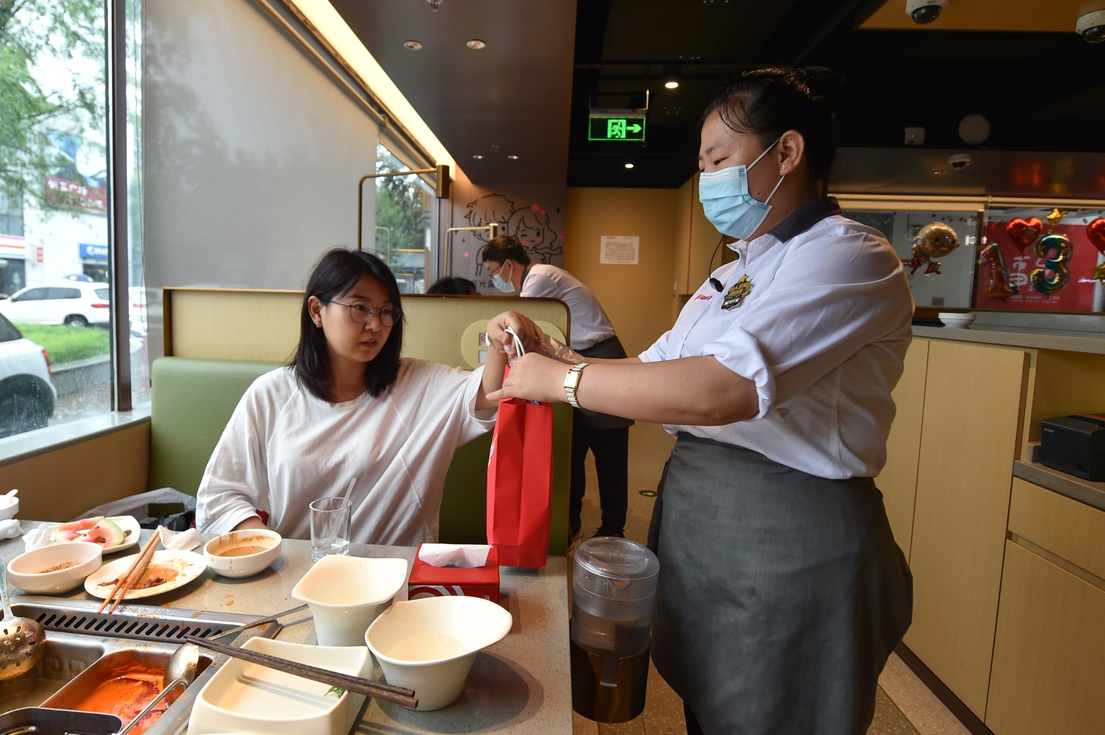 在天津一家火锅餐厅内,服务员在顾客用餐后将需要打包的食物交给顾客(8月19日摄)。近日,为响应制止餐饮浪费行为的号召,天津市多家餐厅通过海报视频宣传、推行小份菜点餐、自助餐制调整为点餐等举措,适应不同顾客的食量需求,从源头着手合理供应餐食,减少餐饮浪费行为。 新华社发 (孙凡越 摄)